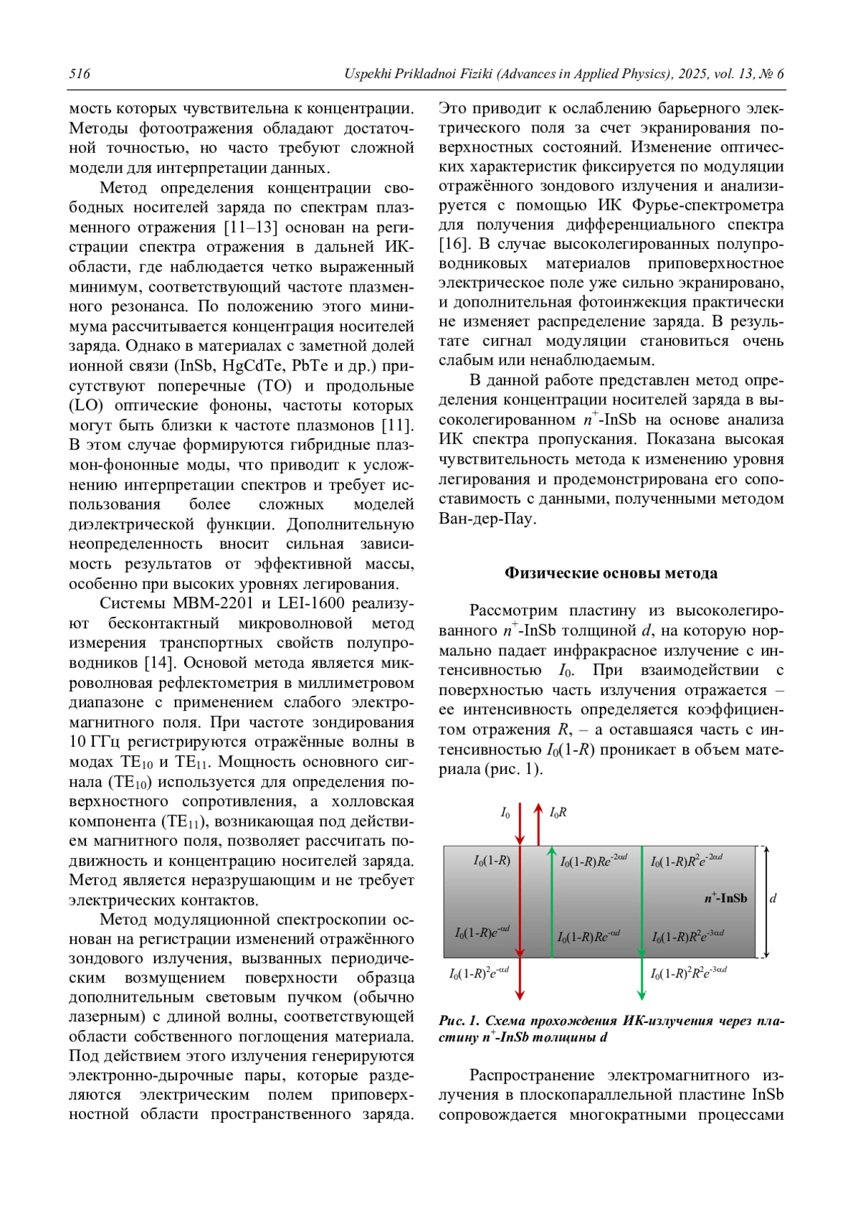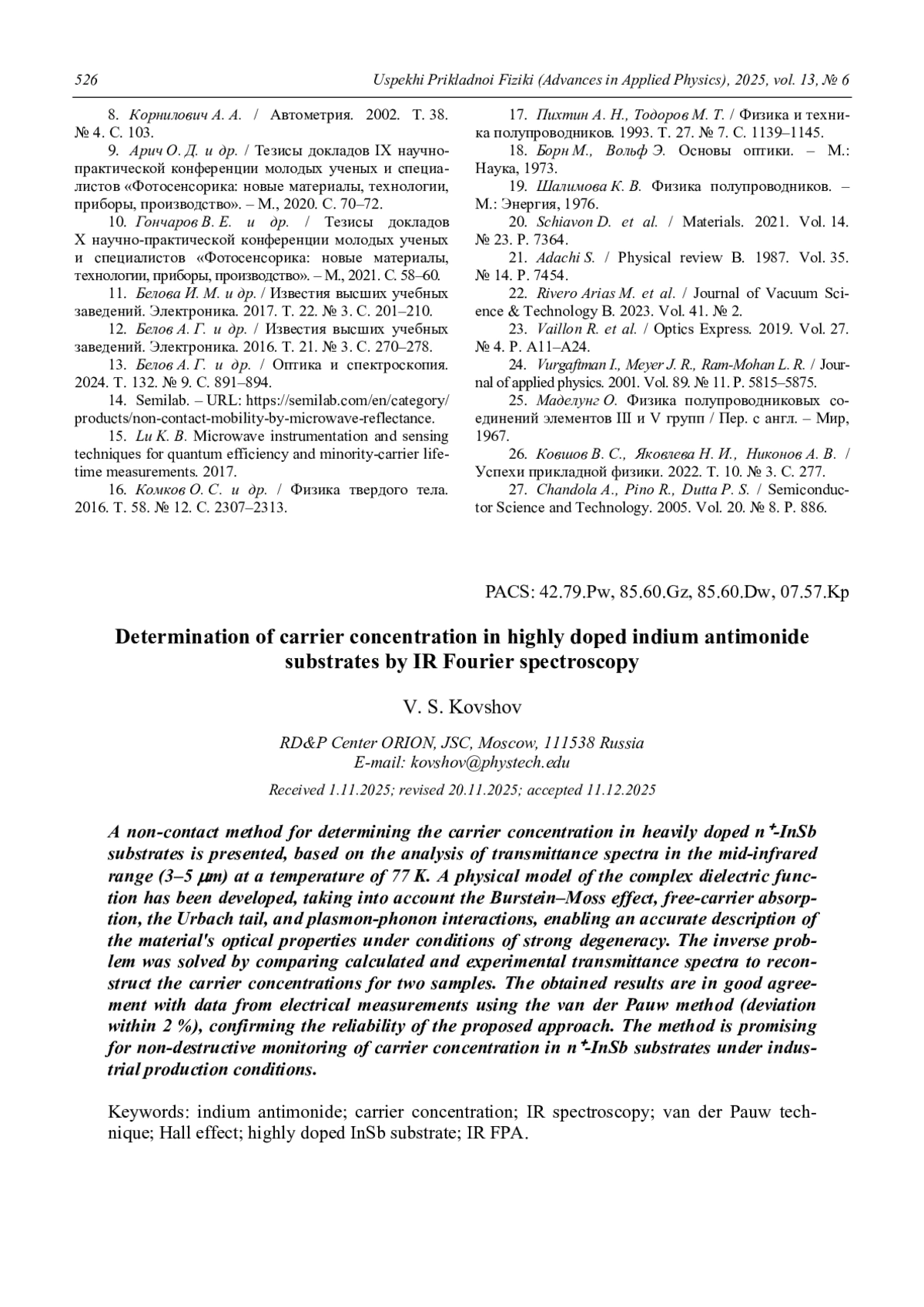 Представлен метод бесконтактного определения концентрации носителей заряда в сильнолегированных подложках n+-InSb на основе анализа спектров пропускания в среднем инфракрасном диапазоне (3–5 мкм) при температуре 77 К. Разработана физическая модель комплексной диэлектрической функции, учитывающая эффект Бурштейна–Мосса, поглощение на свободных носителях, хвост Урбаха и плазмонфононные эффекты, что позволяет корректно описать оптические свойства материала в условиях сильного вырождения. Решена обратная задача: путём сопоставления рассчитанных и экспериментальных спектров пропускания восстановлены значения концентрации носителей для двух образцов. Полученные результаты согласуются с данными электрофизических измерений по методу Ван-дер-Пау (расхождение не более 2 %), что подтверждает достоверность предложенного подхода. Метод перспективен для неразрушающего контроля концентрации носителей заряда в подложках n+-InSb в производственных условиях.