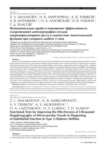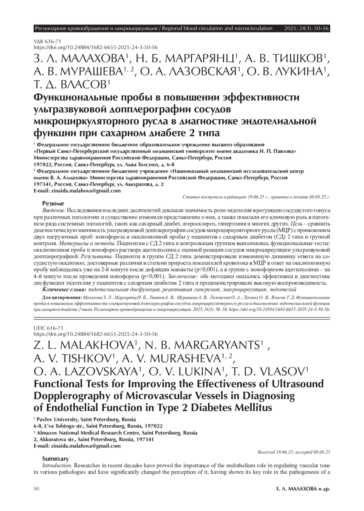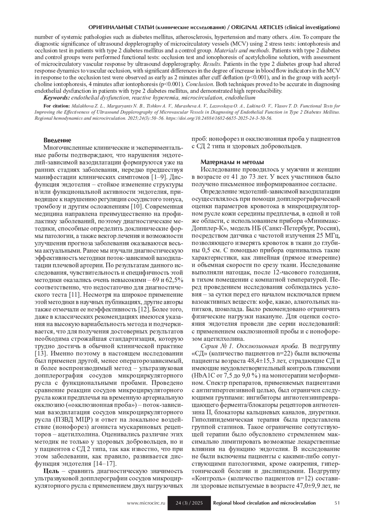 Исследования последних десятилетий доказали значимость роли эндотелия в регуляции сосудистого тонуса при различных патологиях и существенно изменили представление о нем, а также показали его ключевую роль в патогенезе ряда системных патологий, таких как сахарный диабет, атеросклероз, гипертония и многих других. Цель – сравнить диагностическую значимость ультразвуковой допплерографии сосудов микроциркуляторного русла (МЦР) с применением двух нагрузочных проб: ионофореза и окклюзионной пробы у пациентов с сахарным диабетом (СД) 2 типа и группой контроля. Материалы и методы. Пациентам с СД 2 типа и контрольным группам выполнялись функциональные тесты: окклюзионная проба и ионофорез раствора ацетилхолина с оценкой реакции сосудов микроциркуляции ультразвуковой допплерографией. Результаты. Пациенты в группе СД 2 типа демонстрировали измененную динамику ответа на сосудистую окклюзию, достоверные различия в степени прироста показателей кровотока в МЦР в ответ на окклюзионную пробу наблюдались уже на 2-й минуте после дефляции манжеты (р<0,001), а в группе с ионофорезом ацетилхолина – на 4-й минуте после проведения ионофореза (р<0,001). Заключение: обе методики оказались эффективны в диагностике дисфункции эндотелия у пациентов с сахарным диабетом 2 типа и продемонстрировали высокую воспроизводимость.