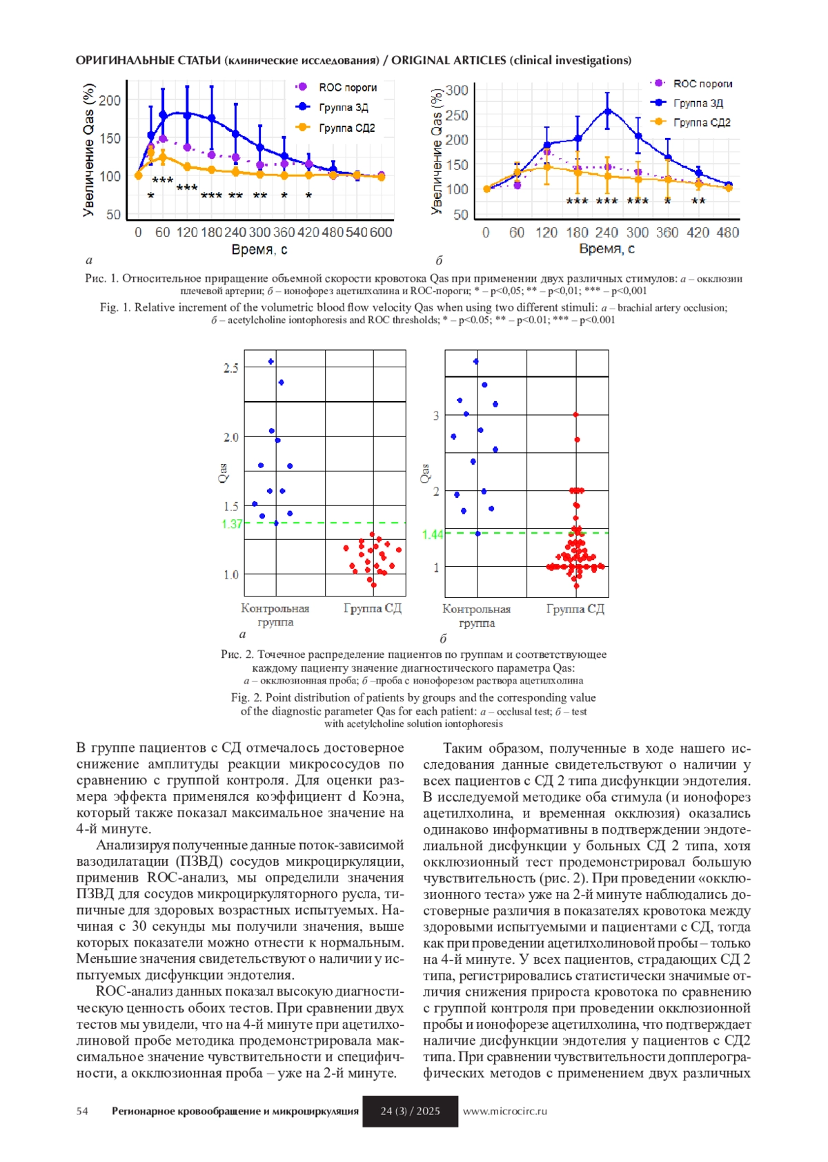 Многочисленные клинические и экспериментальные работы подтверждают, что нарушения эндотелий-зависимой вазодилатации формируются уже на ранних стадиях заболевания, нередко предшествуя манифестации клинических симптомов [1–9]. Дисфункция эндотелия – стойкое изменение структуры и/или функциональной активности эндотелия, приводящее к нарушению регуляции сосудистого тонуса, тромбозу и другим осложнениям [10]. Современная медицина направлена преимущественно на профилактику заболеваний, поэтому диагностические методики, способные определить доклинические формы патологии, а также вектор лечения и возможности улучшения прогноза заболевания оказываются весьма актуальными. Ранее мы изучали диагностическую эффективность методики поток-зависимой вазодилатации плечевой артерии. По результатам данного исследования, чувствительность и специфичность этой методики оказались очень невысокими – 69 и 62,5% соответственно, что недостаточно для диагностического теста [11]. Несмотря на широкое применение этой методики в научных публикациях, другие авторы также отмечали ее неэффективность [12]. Более того, даже в классических рекомендациях имеются указания на высокую вариабельность метода и подчеркивается, что для получения достоверных результатов необходима строжайшая стандартизация, которую трудно достичь в обычной клинической практике [13]. Именно поэтому в настоящем исследовании был применен другой, менее операторозависимый, и более воспроизводимый метод – ультразвуковая допплерография сосудов микроциркуляторного русла с функциональными пробами. Проведено сравнение реакции сосудов микроциркуляторного русла кожи предплечья на временную артериальную окклюзию («окклюзионная проба») – поток-зависимая вазодилатация сосудов микроциркуляторного русла (ПЗВД МЦР) и ответ на локальное воздействие (ионофорез) агониста мускариновых рецепторов – ацетилхолина. Оценивались различие этих методик не только у здоровых добровольцев, но и у пациентов с СД 2 типа, так как известно, что при этом заболевании, как правило, развивается дисфункция эндотелия [14–17].