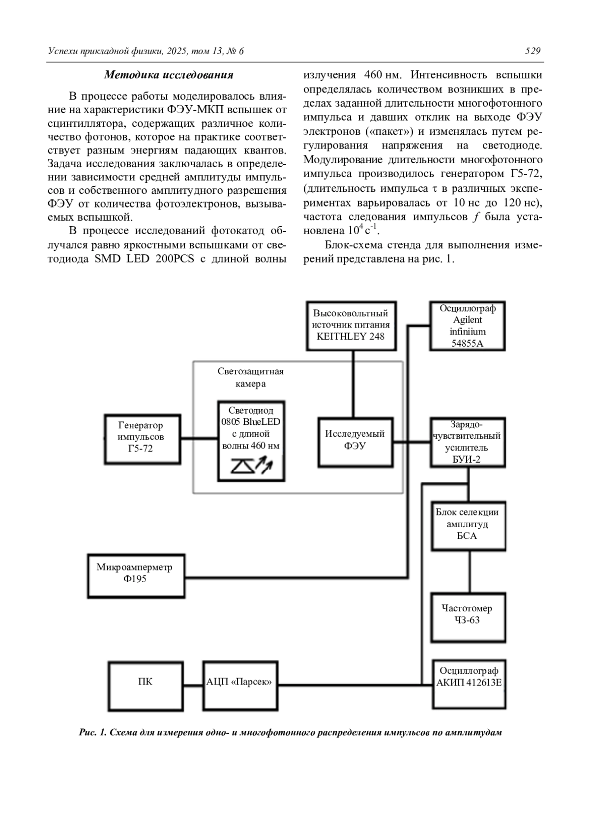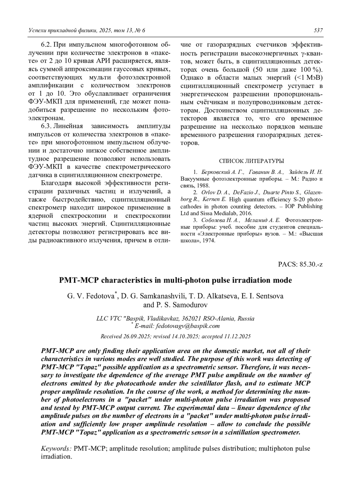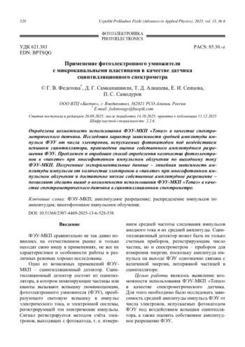 Определена возможность использования ФЭУ-МКП «Топаз» в качестве спектрометрического датчика. Исследован характер зависимости средней амплитуды импульса ФЭУ от числа электронов, испускаемых фотокатодом под воздействием вспышки сцинтиллятора, произведена оценка собственного амплитудного разрешения ФЭУ. Предложен и опробован способ определения количества фотоэлектронов в «пакете» при многофотонном импульсном облучении по выходному току ФЭУ-МКП. Полученные экспериментальные данные – линейная зависимость амплитуды импульсов от количества электронов в «пакете» при многофотонном импульсном облучении и достаточно низкое собственное амплитудное разрешение – позволяют сделать вывод о возможности использования ФЭУ-МКП «Топаз» в качестве спектрометрического датчика в сцинтилляционном спектрометре.