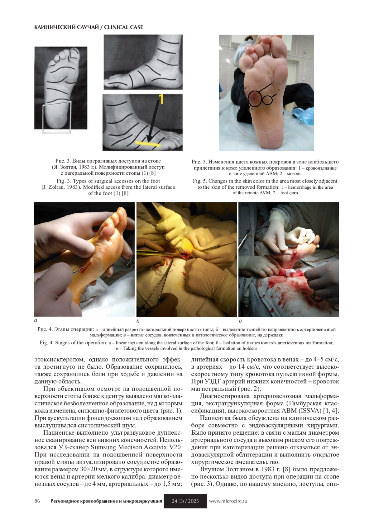 Представлен клинический случай артериовенозной мальформации подошвенной поверхности стопы. На основании клинических данных и ультразвукового дуплексного сканирования выявлена экстратрункулярная форма, высокоскоростная АВМ (ISSVA, 2014 г.). Пациентка была обсуждена на клиническом разборе совместно с эндоваскулярными хирургами – принято решение выполнить открытое хирургическое вмешательство. При выполнении вмешательства был использован доступ с латеральной поверхности стопы, который позволил с минимальной травматизацией тканей произвести удаление образования.