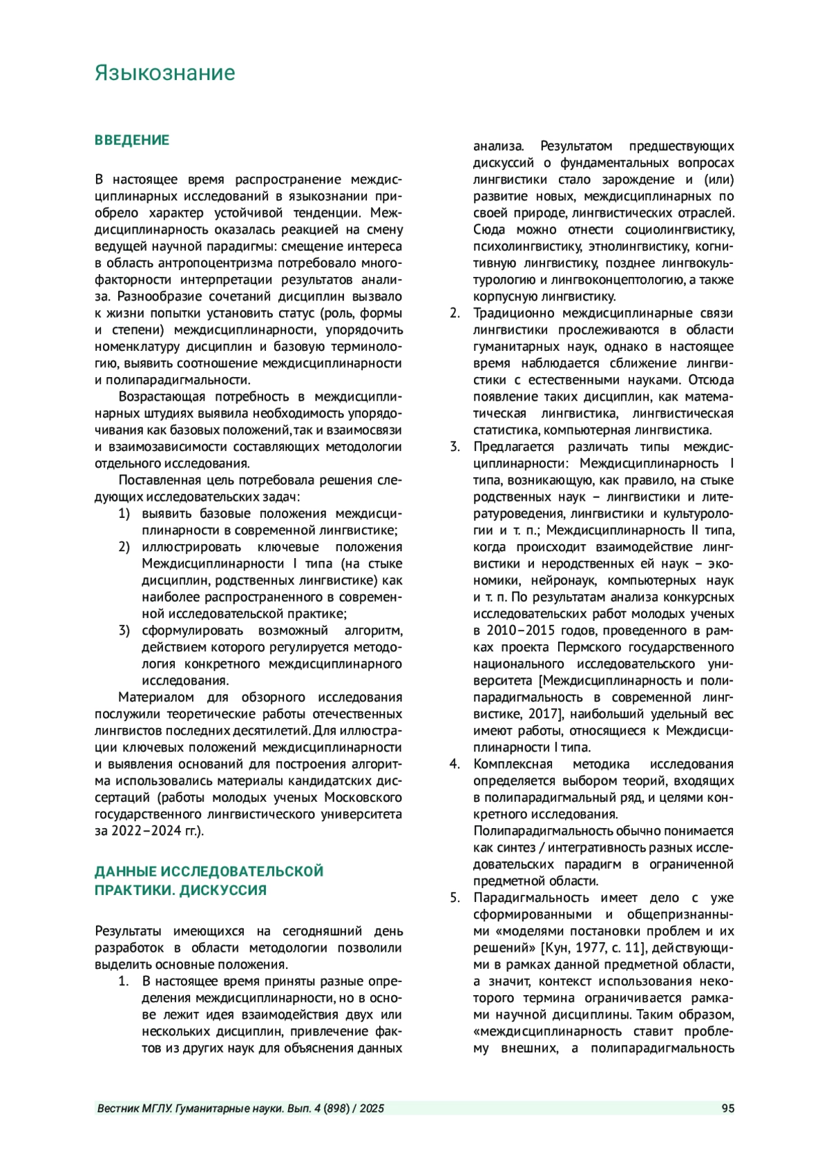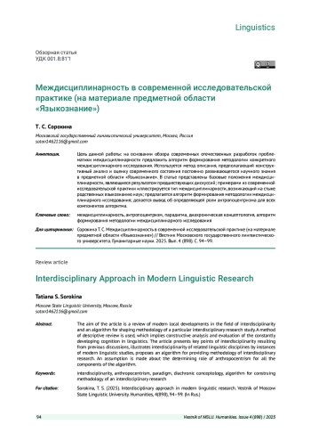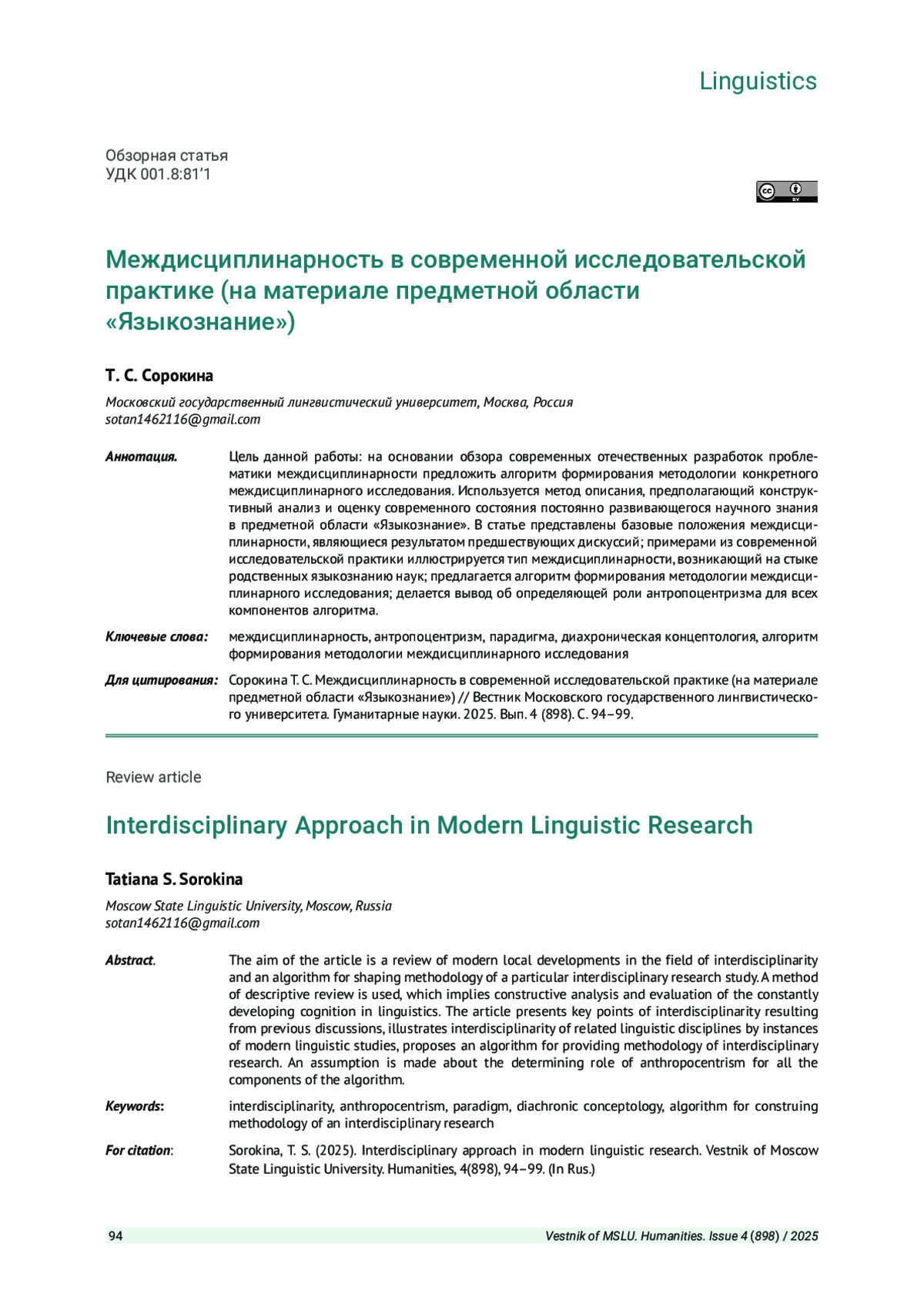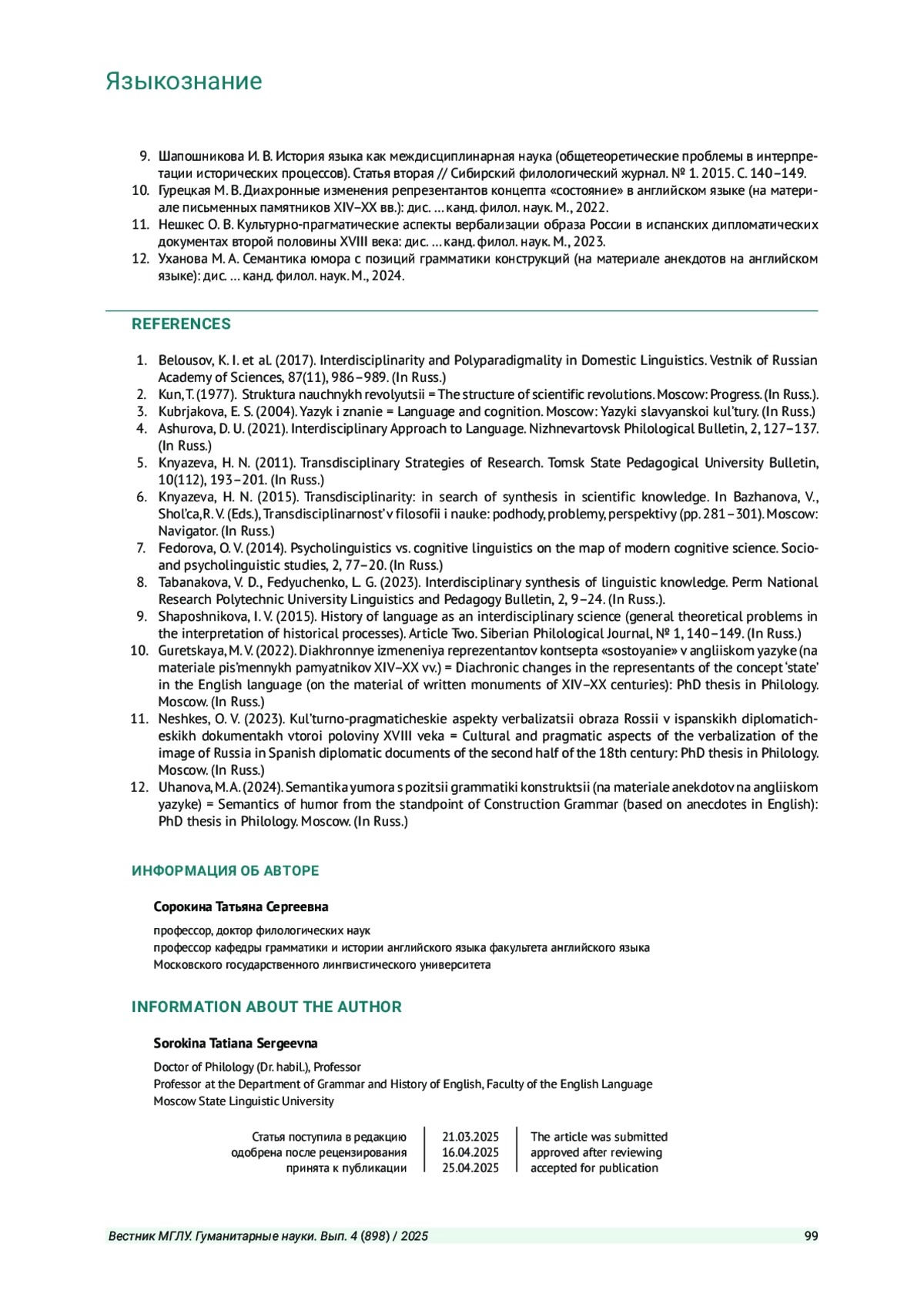 СОРОКИНА Т. С. МЕЖДИСЦИПЛИНАРНОСТЬ В СОВРЕМЕННОЙ ИССЛЕДОВАТЕЛЬСКОЙ ПРАКТИКЕ (НА МАТЕРИАЛЕ ПРЕДМЕТНОЙ ОБЛАСТИ «ЯЗЫКОЗНАНИЕ») // ВЕСТНИК МОСКОВСКОГО ГОСУДАРСТВЕННОГО ЛИНГВИСТИЧЕСКОГО УНИВЕРСИТЕТА. ГУМАНИТАРНЫЕ НАУКИ. 2025. № 4 (898)