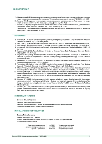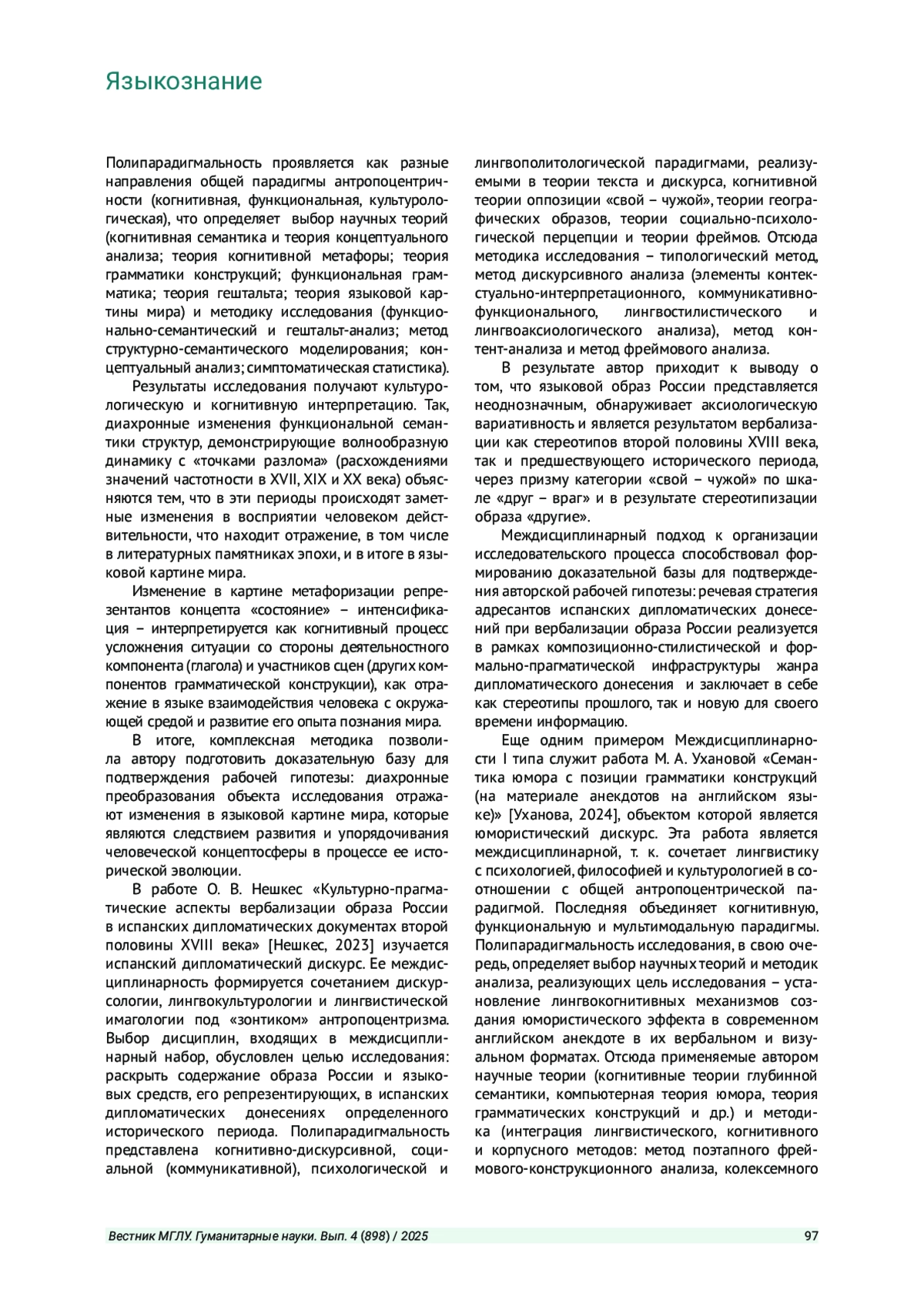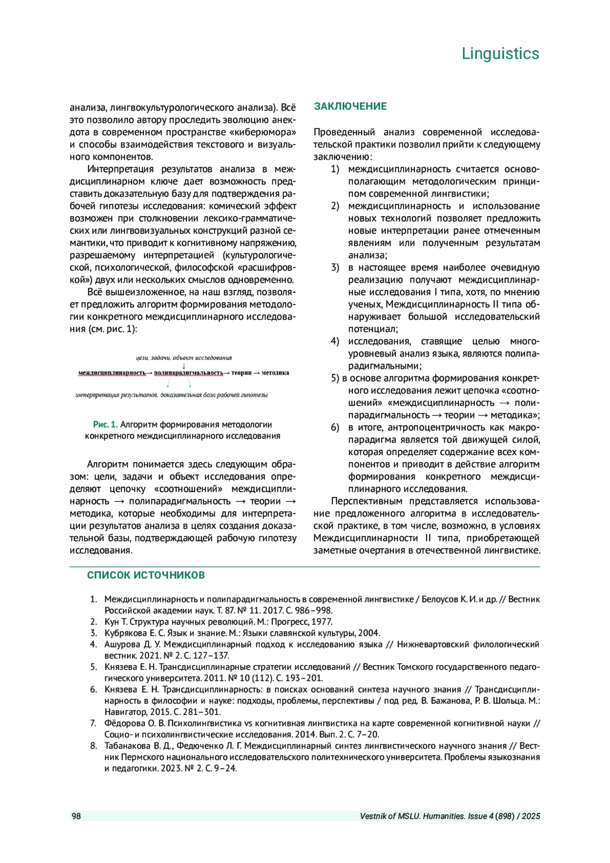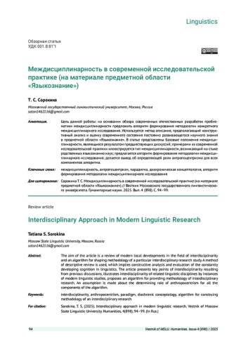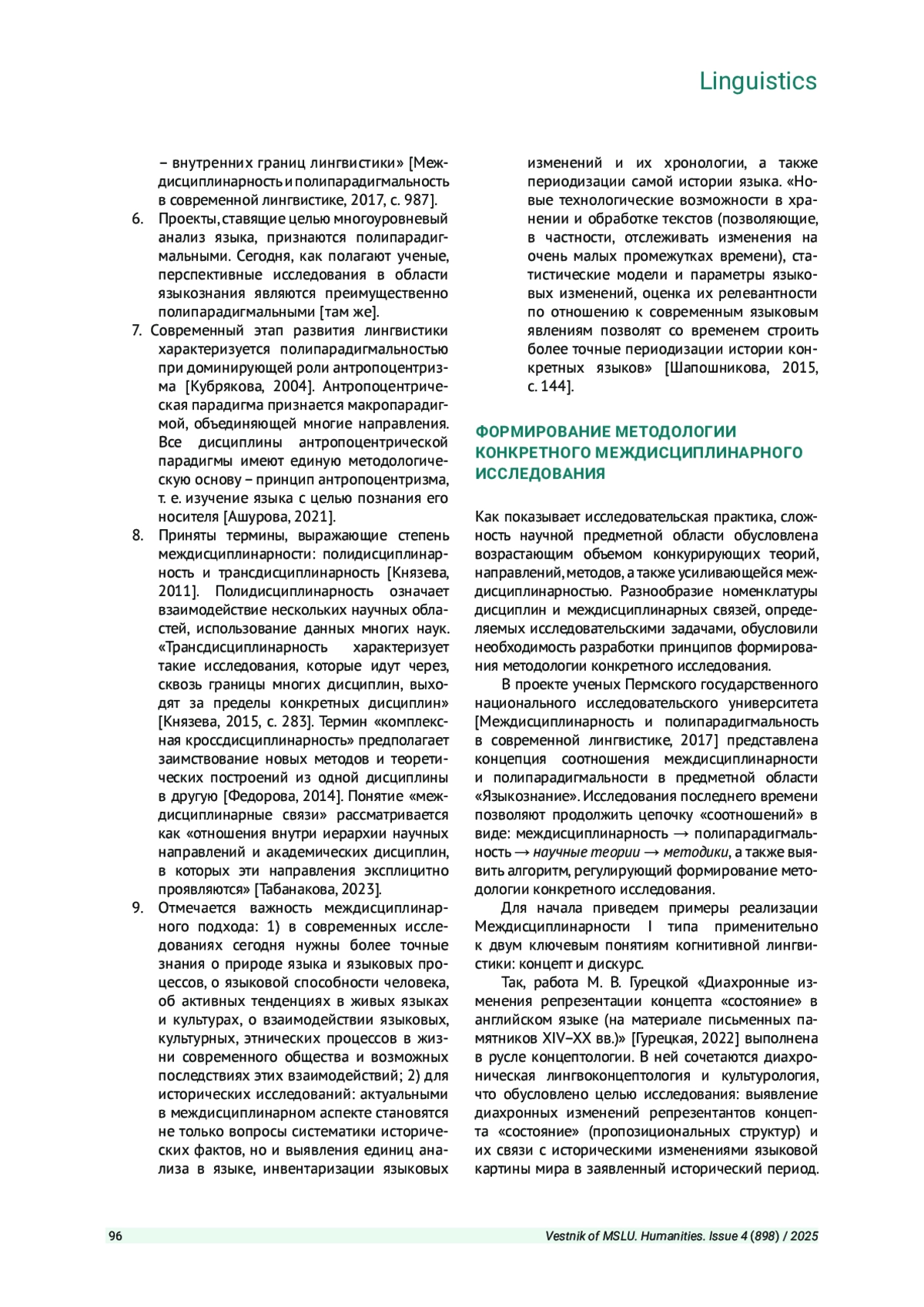 СОРОКИНА Т. С. МЕЖДИСЦИПЛИНАРНОСТЬ В СОВРЕМЕННОЙ ИССЛЕДОВАТЕЛЬСКОЙ ПРАКТИКЕ (НА МАТЕРИАЛЕ ПРЕДМЕТНОЙ ОБЛАСТИ «ЯЗЫКОЗНАНИЕ») // ВЕСТНИК МОСКОВСКОГО ГОСУДАРСТВЕННОГО ЛИНГВИСТИЧЕСКОГО УНИВЕРСИТЕТА. ГУМАНИТАРНЫЕ НАУКИ. 2025. № 4 (898)