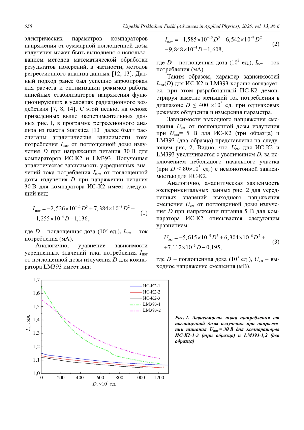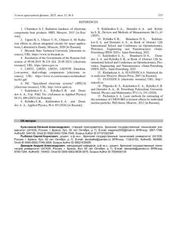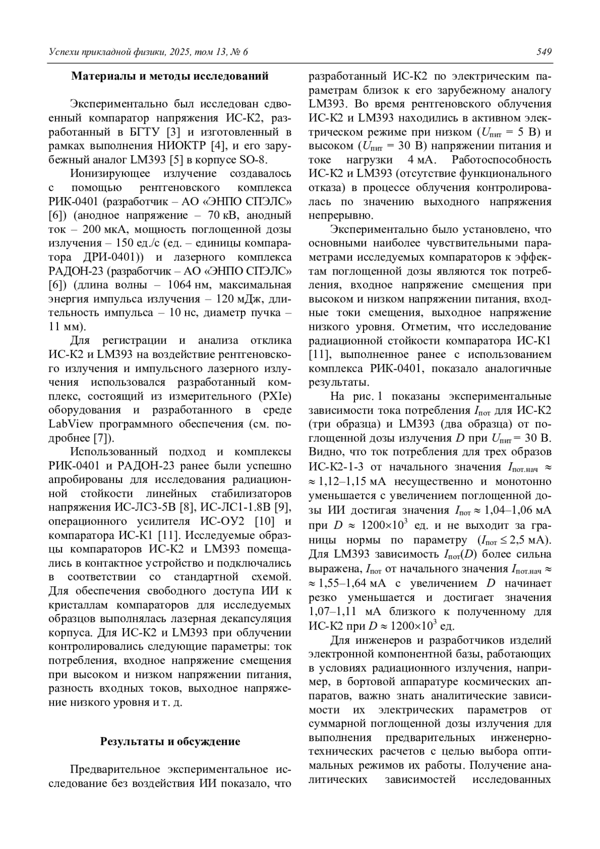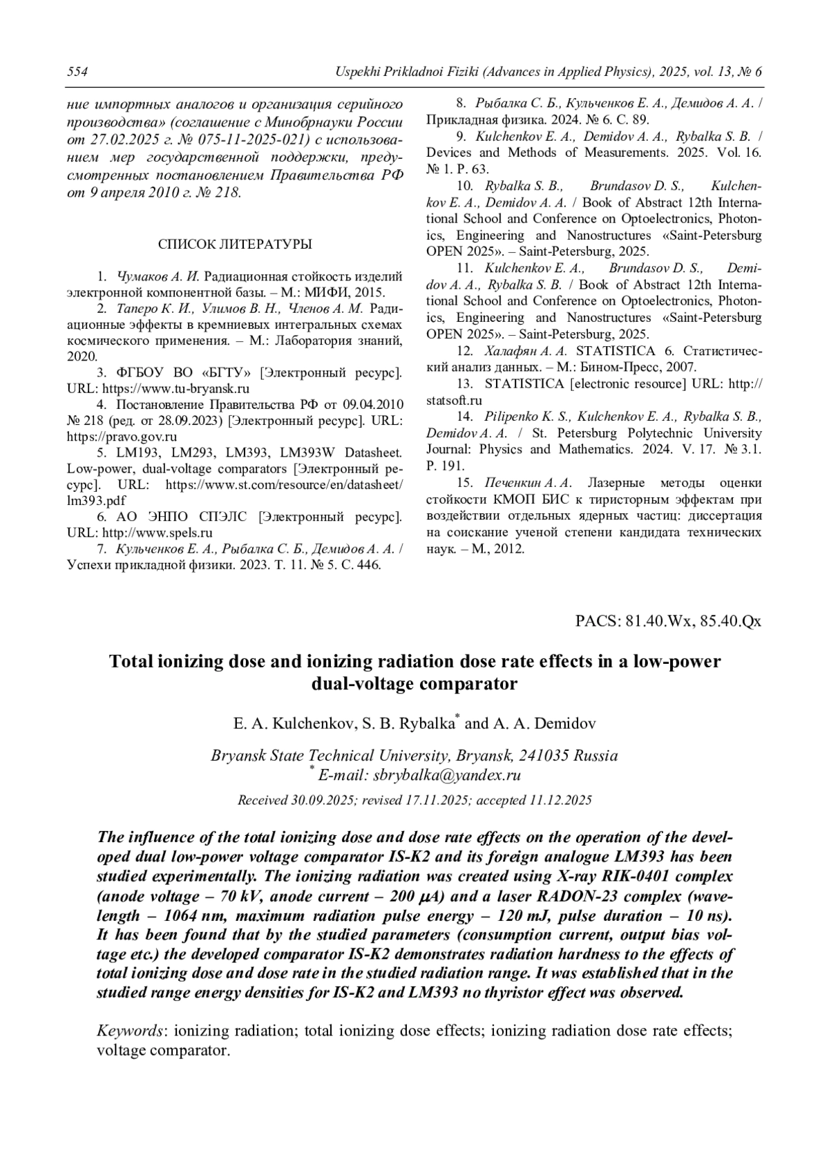 КУЛЬЧЕНКОВ Е. А., РЫБАЛКА С. Б., ДЕМИДОВ А. А. ИССЛЕДОВАНИЯ РАДИАЦИОННОЙ СТОЙКОСТИ СДВОЕННОГО МИКРОМОЩНОГО КОМПАРАТОРА НАПРЯЖЕНИЯ // УСПЕХИ ПРИКЛАДНОЙ ФИЗИКИ. 2025. ТОМ 13, №6