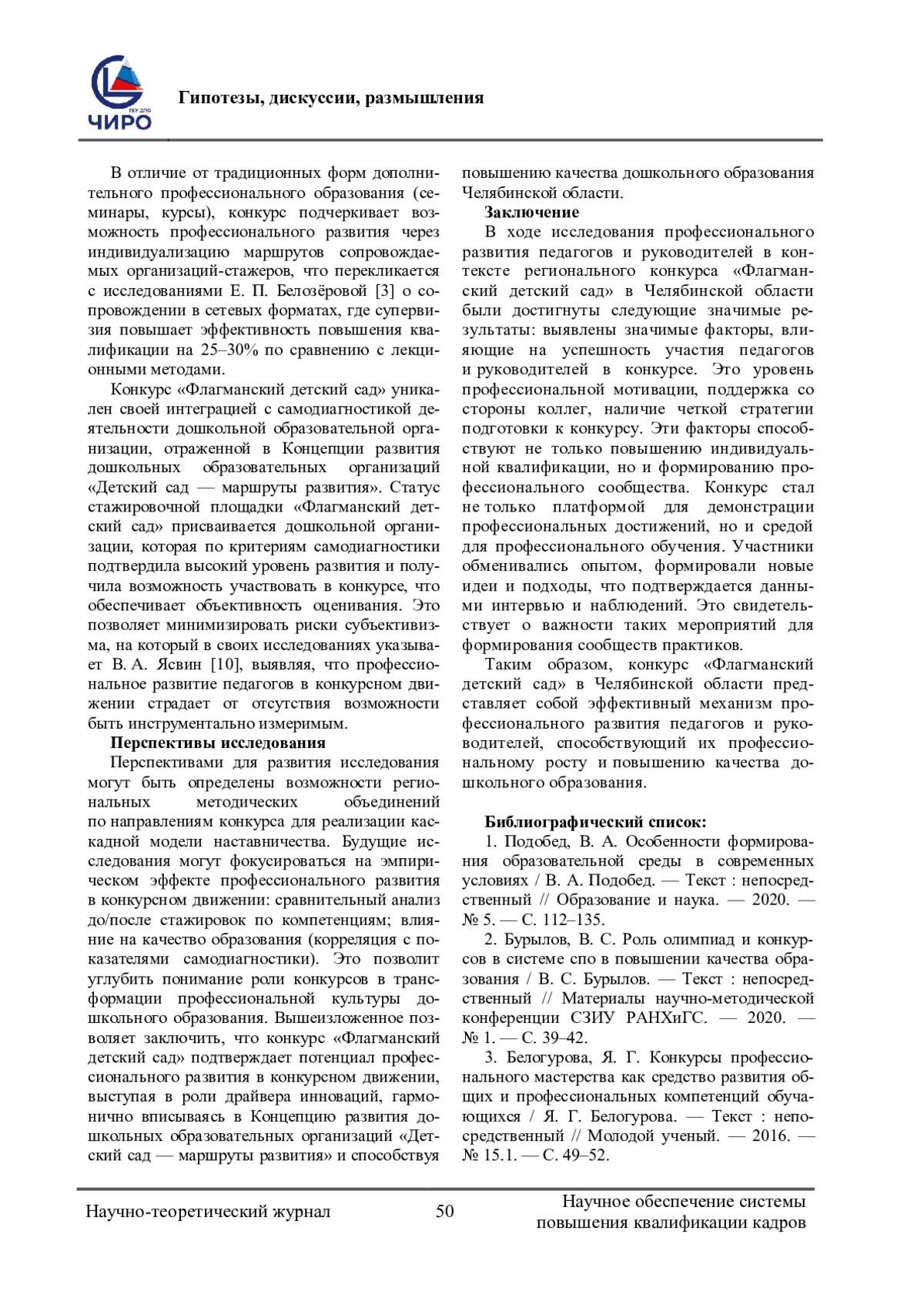 Проблема исследования и обоснование ее актуальности. Актуальность исследования обусловлена необходимостью изучения возможностей профессионального развития педагогов и руководителей в условиях конкурсного движения. В статье рассматривается практика регионального конкурса «Флагманский детский сад» в Челябинской области, который стимулирует инновационную активность, обмен лучшими практиками в формате наставничества и формирование профессиональных сообществ. Исследование раскрывает потенциал конкурса как инструмента мотивации и методической поддержки, анализирует его влияние на качество дошкольного образования. Особое внимание уделено выявленным эффектам: росту педагогической инициативы, внедрению перспективных образовательных технологий и созданию сети наставничества. Результаты могут быть использованы для совершенствования системы непрерывного профессионального развития педагогов в других регионах РФ. Цель исследования. Целью исследования является оценка возможностей профессионального развития педагогов и руководителей дошкольных образовательных организаций в рамках регионального конкурса «Флагманский детский сад» в Челябинской области. Это включает в себя изучение влияния конкурса на повышение квалификации участников, обмен инновационными практиками и формирование профессиональных сообществ в формате наставничества, а также разработку рекомендаций по оптимизации конкурсной практики для повышения качества дошкольного образования в регионе. Методология (материалы и методы). В рамках исследования использован комплексный подход, включающий как качественные, так и количественные методы анализа. Изучение нормативных актов, регламентирующих проведение конкурса «Флагманский детский сад», а также материалов, связанных с его организацией и проведением. Это позволит выявить ключевые аспекты возможностей профессионального развития в формате конкурса. Обработка собранных количественных данных с использованием статистических методов для выявления закономерностей и тенденций в профессиональном развитии педагогов Челябинской области. Результаты. Проведенное исследование позволило выявить ключевые эффекты влияния конкурса «Флагманский детский сад» на профессиональное развитие педагогов и руководителей дошкольных образовательных организаций Челябинской области. Для участников были организованы обучающие семинары, консультации экспертов, сформирована система наставничества, что позволило создать устойчивую среду для профессионального роста и обмена лучшими практиками. Реализация конкурса подтвердила его эффективность как инструмента повышения качества дошкольного образования. Разработанные в ходе исследования методические рекомендации по сопровождению участников и постконкурсному внедрению лучших практик могут быть использованы для совершенствования системы дошкольного образования не только в Челябинской области, но и в других регионах РФ. Научная новизна заключается в том, что разработан алгоритм создания стажировочной площадки, необходимый для обеспечения профессионального развития педагогов в контексте деятельности стажировочной площадки «Флагманский детский сад», предложены критерии регионального конкурса «Флагманский детский сад», новизна которых зак