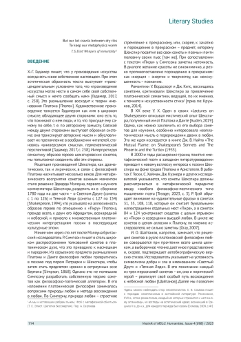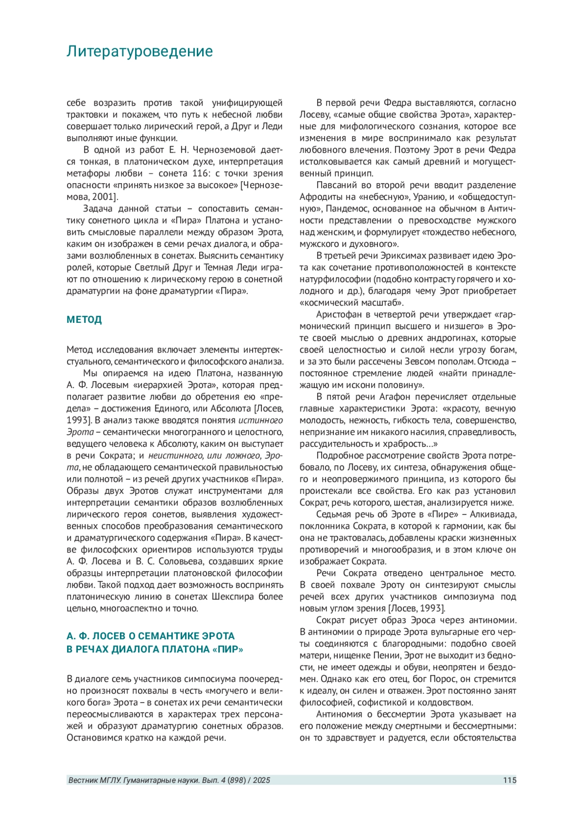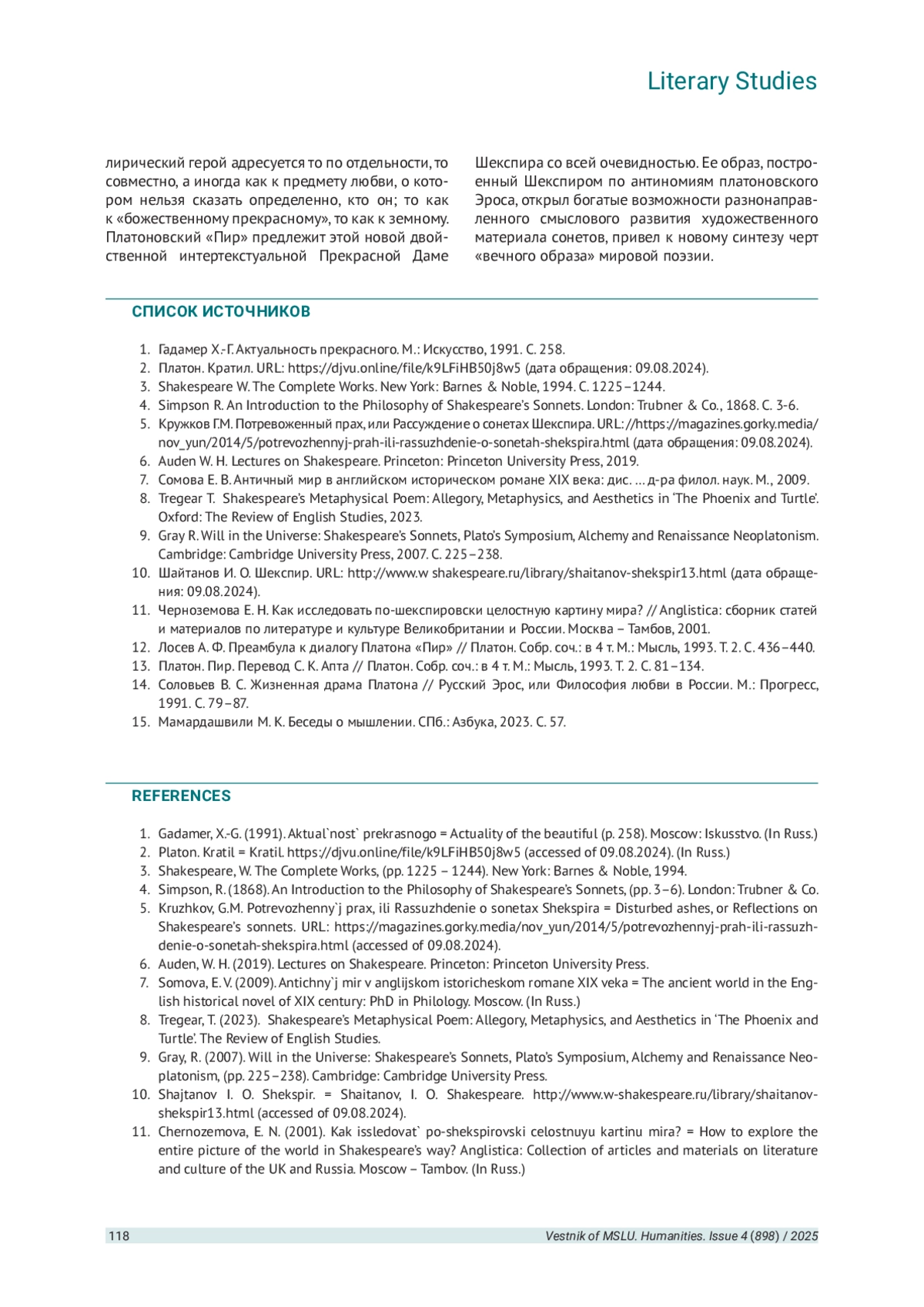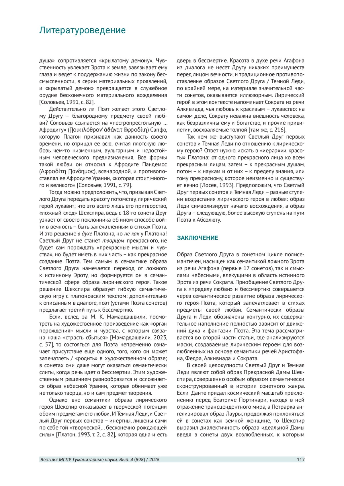 Статья: К ВОПРОСУ РЕЦЕПЦИИ СОНЕТОВ ШЕКСПИРА НА ФОНЕ ДИАЛОГА ПЛАТОНА «ПИР». СЕМАНТИКА ОБРАЗОВ ПЕРСОНАЖЕЙ И ОБРАЗА АВТОРА. ЧАСТЬ 1 (2025)