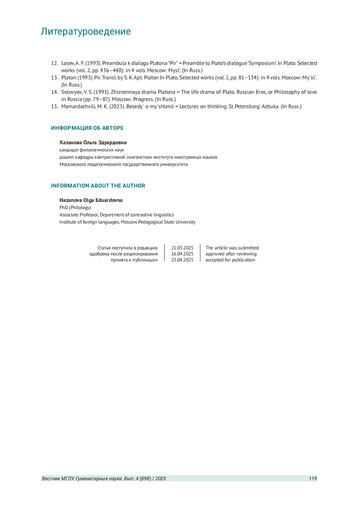 ХАЗАНОВА О. Э. К ВОПРОСУ РЕЦЕПЦИИ СОНЕТОВ ШЕКСПИРА НА ФОНЕ ДИАЛОГА ПЛАТОНА «ПИР». СЕМАНТИКА ОБРАЗОВ ПЕРСОНАЖЕЙ И ОБРАЗА АВТОРА. ЧАСТЬ 1 // ВЕСТНИК МОСКОВСКОГО ГОСУДАРСТВЕННОГО ЛИНГВИСТИЧЕСКОГО УНИВЕРСИТЕТА. ГУМАНИТАРНЫЕ НАУКИ. 2025. № 4 (898)
