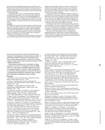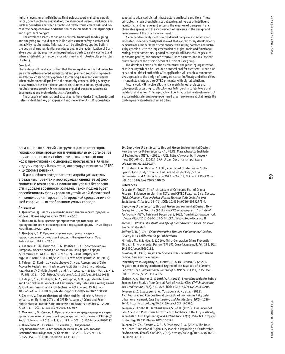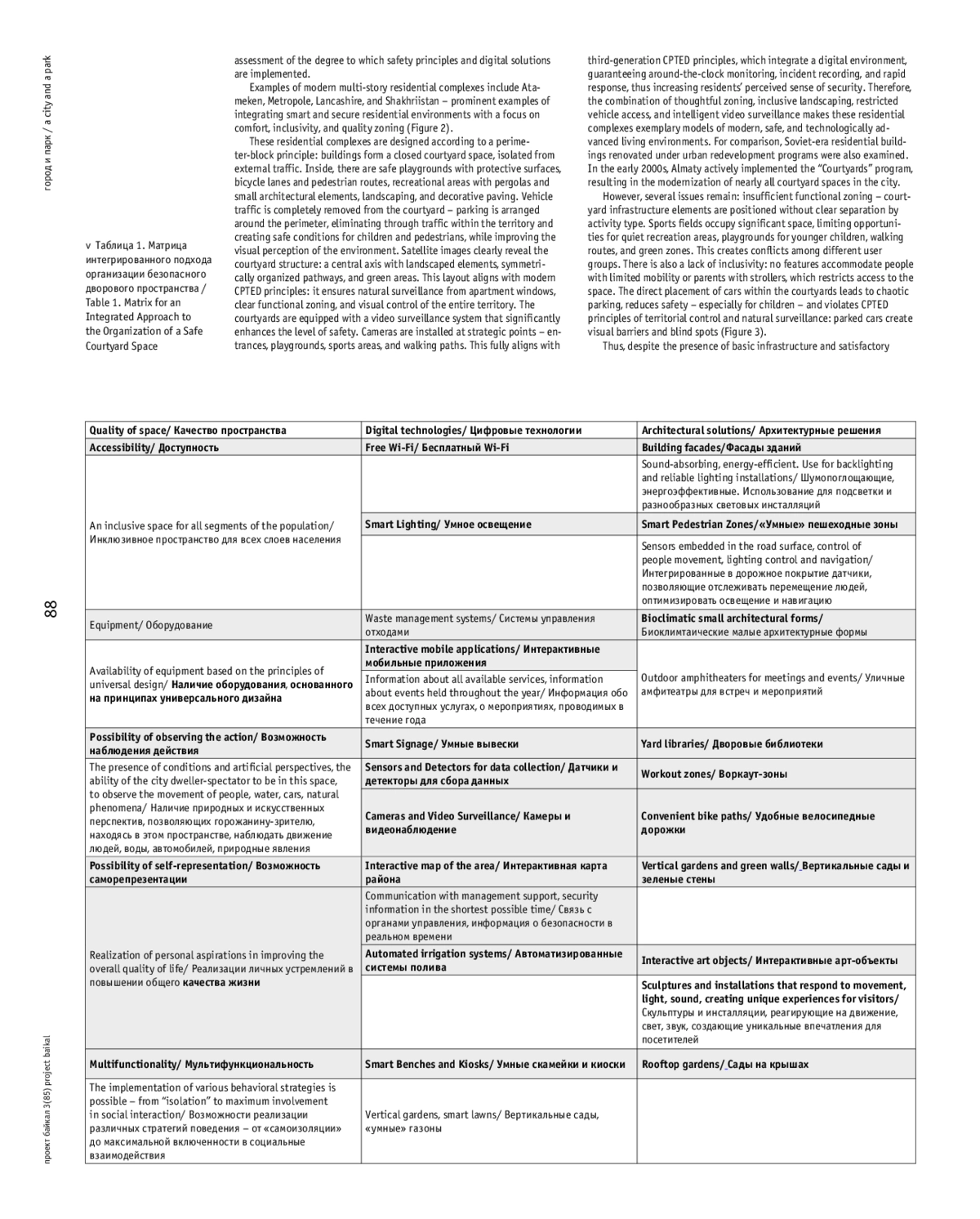 Настоящее исследование направлено на выявление и обоснование взаимосвязи цифровых технологий и архитектурно-планировочных решений как интегрированного подхода, соответствующего требованиям современных умных городов. В условиях активной трансформации пространственной среды города Алма-Аты (Алматы) особенно актуален поиск эффективных методов организации безопасных дворовых пространств. В результате проведенного сравнительного анализа и изучения опыта про ектирования безопасных дворовых территорий в современных умных городах разработана матрица интегрированного подхода организации безопасного двора, сочетающая принципы CPTED третьего поколения.