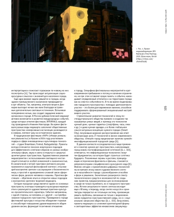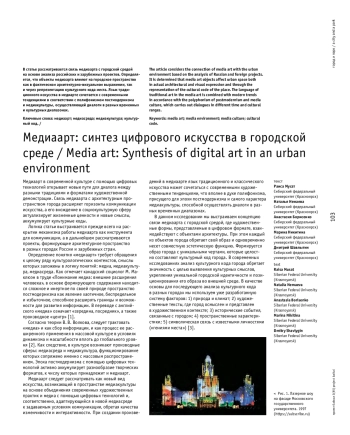 В статье рассматривается связь медиаарта с городской средой на основе анализа российских и зарубежных проектов. Определяется, что объекты медиаарта влияют на городское пространство как в фактическом архитектурно-визуальном выражении, так и через репрезентацию культурного кода места. Язык традиционного искусства в медиарте сочетается с современными тенденциями в соответствии с полифонизмом постмодернизма и медиакультуры, осуществляющей диалоги в разных временных и культурных диапазонах.