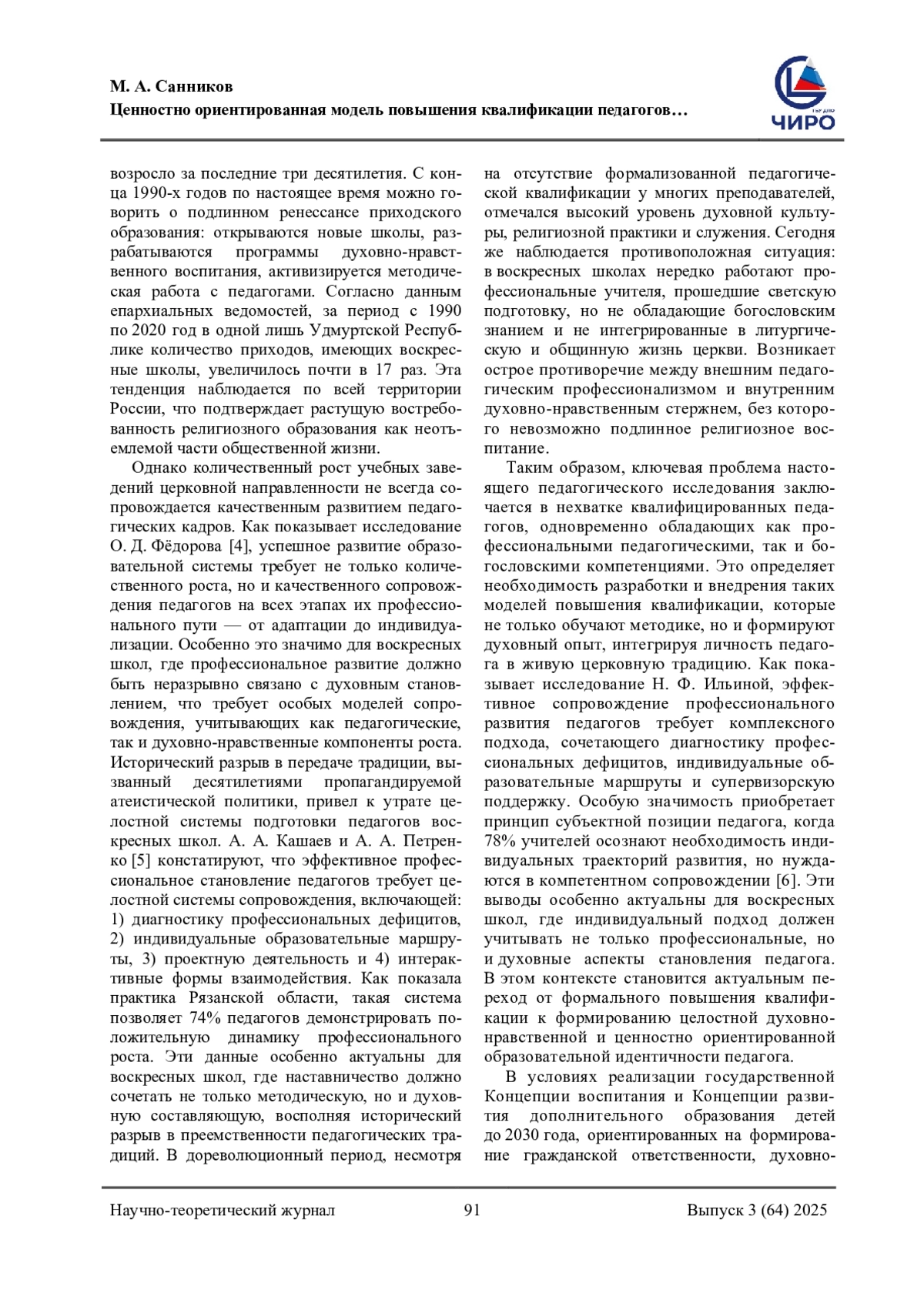 Проблема исследования и обоснование ее актуальности. Современная система образования, включая религиозное, сталкивается кризисом духовно-нравственных ориентиров, что особенно остро проявляется в деятельности воскресных школ. Несмотря на рост их количества, наблюдается дефицит педагогов, сочетающих профессиональные педагогические компетенции с глубокой духовной зрелостью, что снижает эффективность воспитательного процесса. Данная проблема требует разработки новых моделей повышения квалификации, интегрирующих методическую подготовку с духовным становлением педагога. Цель исследования. Разработка и апробация ценностно ориентированной модели повышения квалификации педагогов воскресных школ, направленной на формирование профессиональной идентичности, основанной на синтезе педагогического мастерства и духовно-нравственных ценностей. Методология (материалы и методы). Исследование проводилось на выборке из 35 педагогов воскресных школ Удмуртской Республики с использованием смешанного дизайна: количественные методы (опросник эмоционального интеллекта «ЭмИн», шкала Меграбяна, тест «Рука») и качественные (интервью, наблюдение, анализ рефлексивных заметок). Программа «Слушание сердцем» (72 академических часа) включала модули по духовно-нравственному воспитанию и практической апробации авторских методик. Результаты. Участники продемонстрировали статистически значимый рост эмоционального интеллекта (ΔОЭИ = +13,8 балла, p<0,01), снижение уровня агрессии (-10%) и увеличение эмпатийности (+12,2 балла). Качественный анализ выявил трансформацию профессиональной идентичности: 82,8% педагогов использовали в рефлексиях категории «служение», «смирение», «любовь». Практическая апробация показала увеличение использования духовно-нравственных методов на 55% (с 18 до 73% учебного времени). Результаты подтверждают, что ценностно ориентированная модель эффективно формирует не только профессиональные навыки, но и духовно-нравственную зрелость педагога.