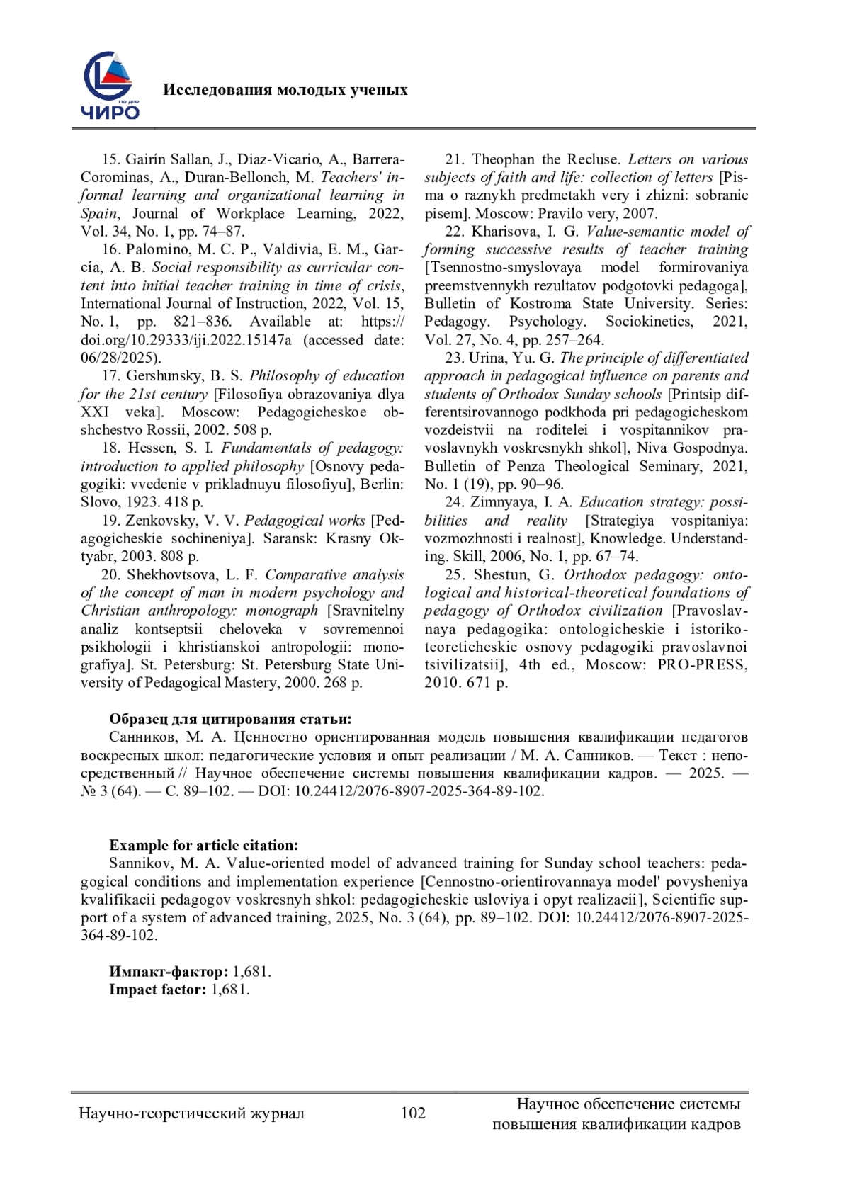 3. Дивногорцева, С. Ю. Проектирование логики и содержания подготовки будущих педагогов к преподаванию православного вероучения в школе / С. Ю. Дивногорцева. - Текст: непосредственный // Вестник Православного Свято-Тихоновского гуманитарного университета. Серия 4: Педагогика. Психология. - 2022. - № 66. - С. 13-24. EDN: KRKFPU