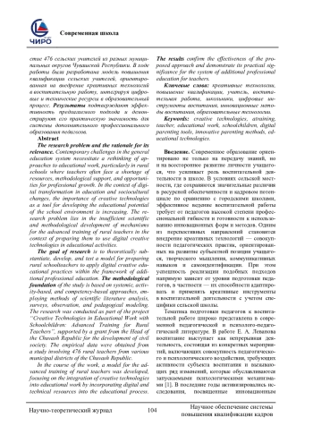 Проблема исследования и обоснование ее актуальности. Современные вызовы в системе общего образования требуют переосмысления подходов к воспитательной работе, особенно в условиях сельской школы, где педагоги нередко испытывают дефицит ресурсов, методической поддержки и возможностей профессионального роста. В условиях цифровой трансформации образования и социокультурных изменений возрастает значение креативных технологий как инструмента развития воспитательного потенциала школьной среды. Проблема исследования заключается в недостаточной научно-методической проработанности механизмов повышения квалификации сельских учителей в контексте формирования готовности к использованию цифровых креативных технологий в воспитательной деятельности. Цель исследования теоретическое обоснование, разработка и апробация модели подготовки педагогов сельских школ к применению цифровых креативных воспитательных практик в рамках дополнительного профессионального образования. Методология (материалы и методы). Методологическую основу составили системный, деятельностный и компетентностный подходы, методы анализа научных источников, анкетирования, наблюдения и педагогического моделирования. Исследование выполнено в рамках реализации проекта «Креативные технологии в воспитательной работе со школьниками: повышение квалификации сельских учителей», поддержанного грантом Главы Чувашской Республики на развитие гражданского общества. Эмпирическую базу составили данные, полученные в результате исследования, в котором приняли участие 476 сельских учителей из разных муниципальных округов Чувашской Республики. В ходе работы была разработана модель повышения квалификации сельских учителей, ориентированная на внедрение креативных технологий в воспитательную работу, интегрируя цифровые и технические ресурсы в образовательный процесс. Результаты подтверждают эффективность предлагаемого подхода и демонстрируют его практическую значимость для системы дополнительного профессионального образования педагогов.