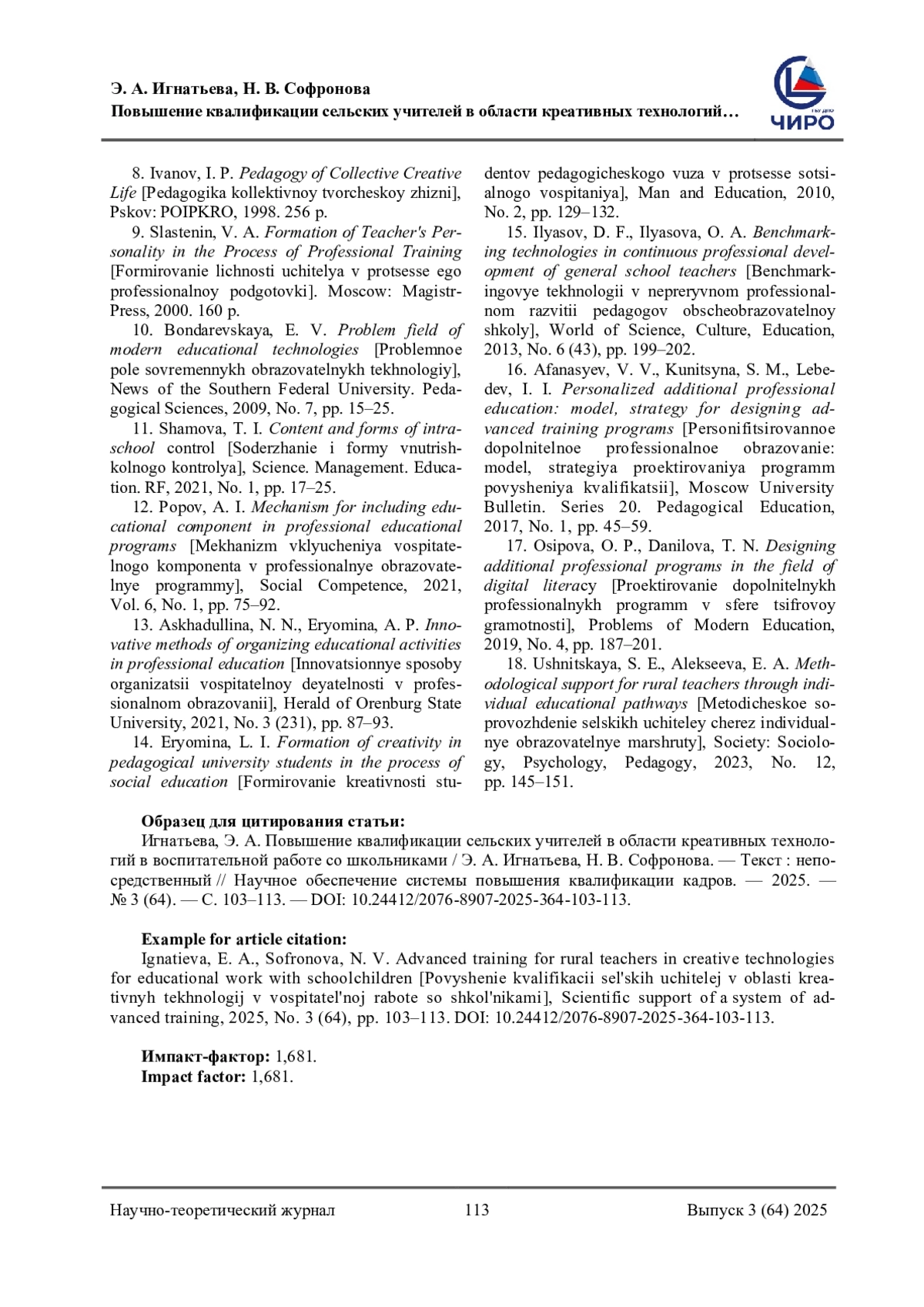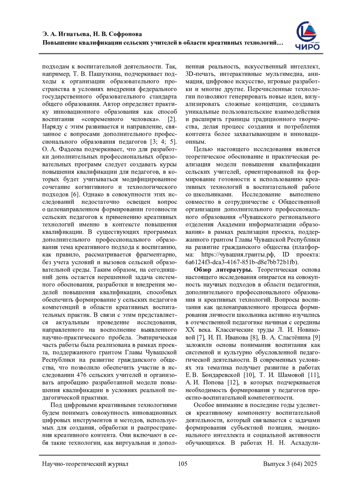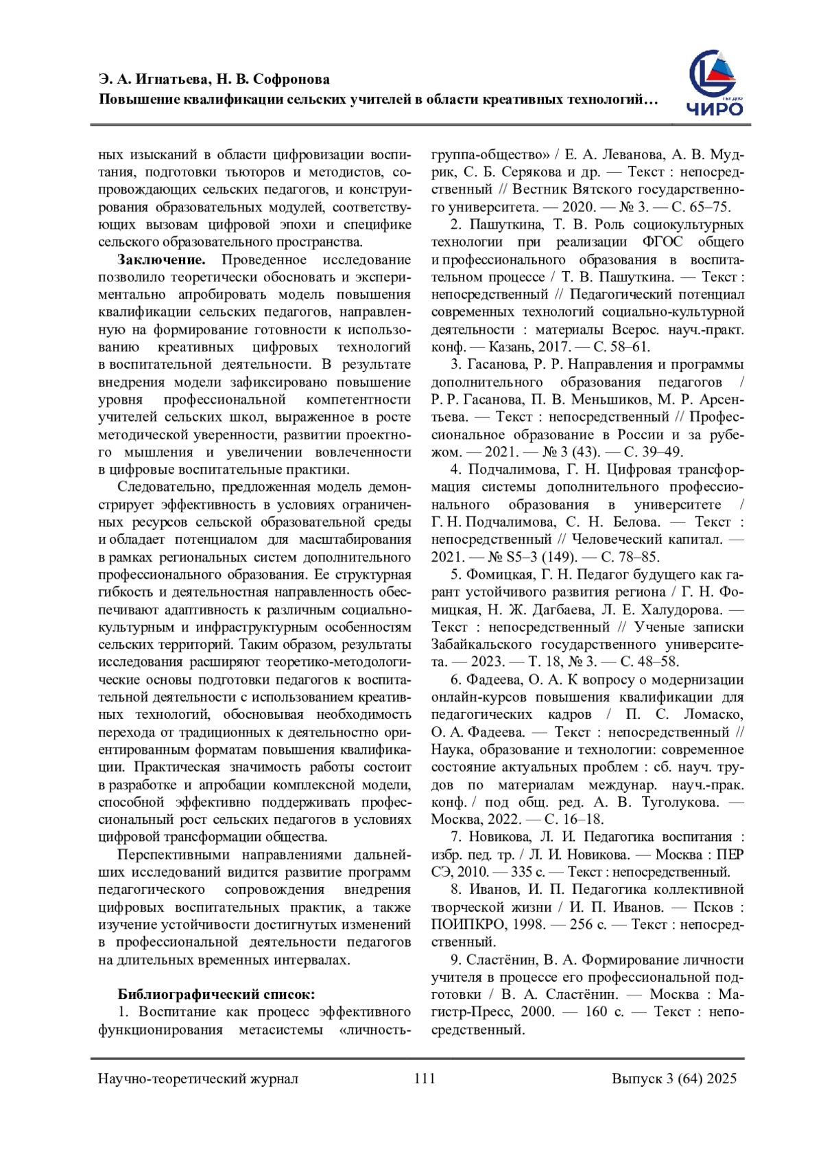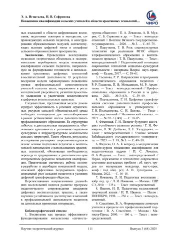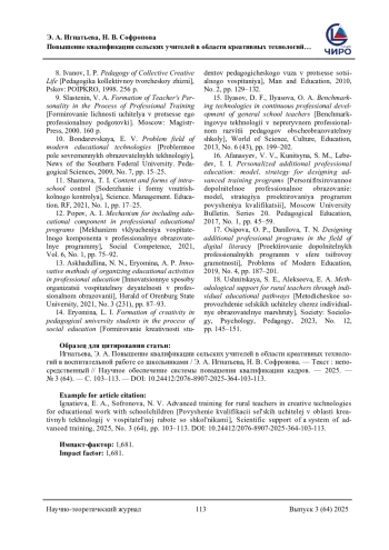 ИГНАТЬЕВА Э. А., СОФРОНОВА Н. В. ПОВЫШЕНИЕ КВАЛИФИКАЦИИ СЕЛЬСКИХ УЧИТЕЛЕЙ В ОБЛАСТИ КРЕАТИВНЫХ ТЕХНОЛОГИЙ В ВОСПИТАТЕЛЬНОЙ РАБОТЕ СО ШКОЛЬНИКАМИ // НАУЧНОЕ ОБЕСПЕЧЕНИЕ СИСТЕМЫ ПОВЫШЕНИЯ КВАЛИФИКАЦИИ КАДРОВ. 2025. № 3 (64) (13 СТ.)