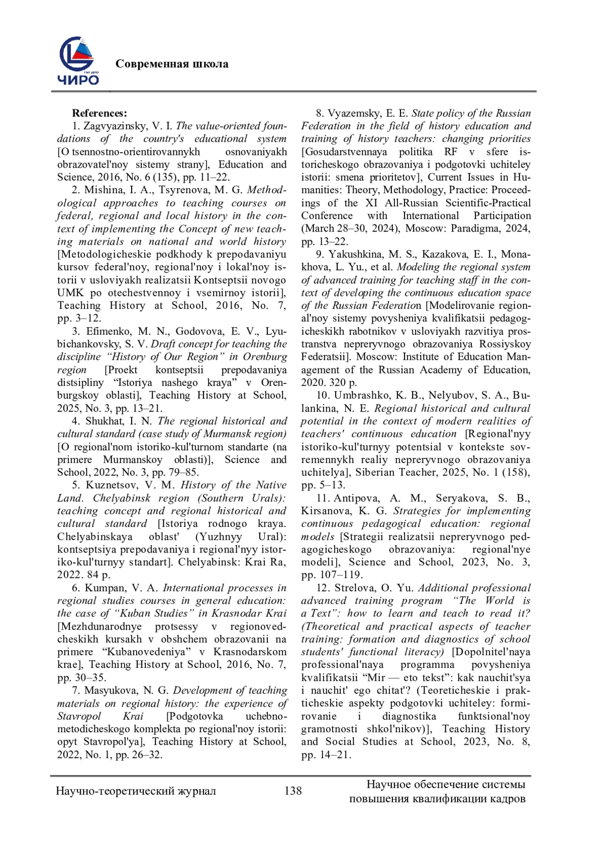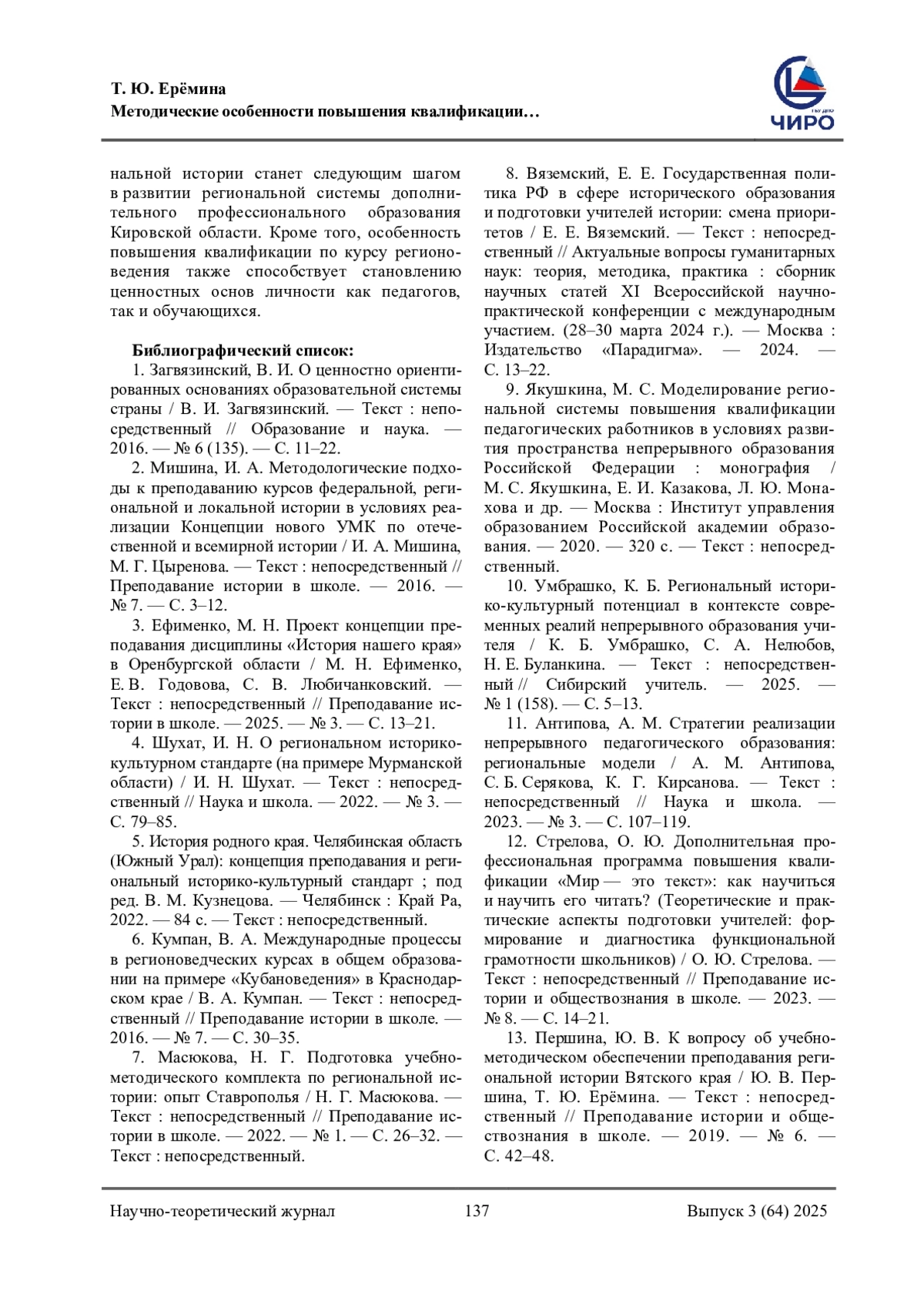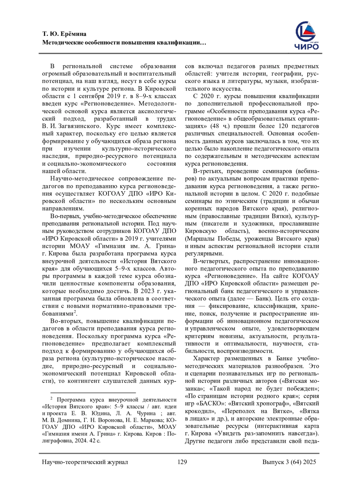 ЕРЕМИНА Т. Ю. МЕТОДИЧЕСКИЕ ОСОБЕННОСТИ ПОВЫШЕНИЯ КВАЛИФИКАЦИИ ПО КУРСУ «РЕГИОНОВЕДЕНИЕ» ДЛЯ УЧИТЕЛЕЙ ОБЩЕОБРАЗОВАТЕЛЬНЫХ ОРГАНИЗАЦИЙ КИРОВСКОЙ ОБЛАСТИ // НАУЧНОЕ ОБЕСПЕЧЕНИЕ СИСТЕМЫ ПОВЫШЕНИЯ КВАЛИФИКАЦИИ КАДРОВ. 2025. № 3 (64) (13 СТ.)