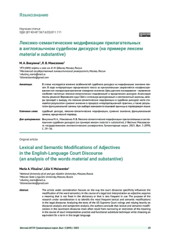 В статье исследуется влияние особенностей судебного дискурса на модификацию значения лексем. В ходе интерпретации юридического текста за прилагательным закрепляется незафиксированное или малораспространенное словарное значение. Цель данного исследования - выявление наиболее частотных лексико-семантических модификаций в юридическом дискурсе. Анализируя тексты решений Верховного суда США и используя дискурсивный и компонентный анализы, авторы приходят к выводу, что лексико-семантические модификации в судебном дискурсе часто становятся результатом сужения значения в процессе интерпретационной практики, а также результатом функциональной замены при выборе эквивалента языковой единицы в переводящем языке.