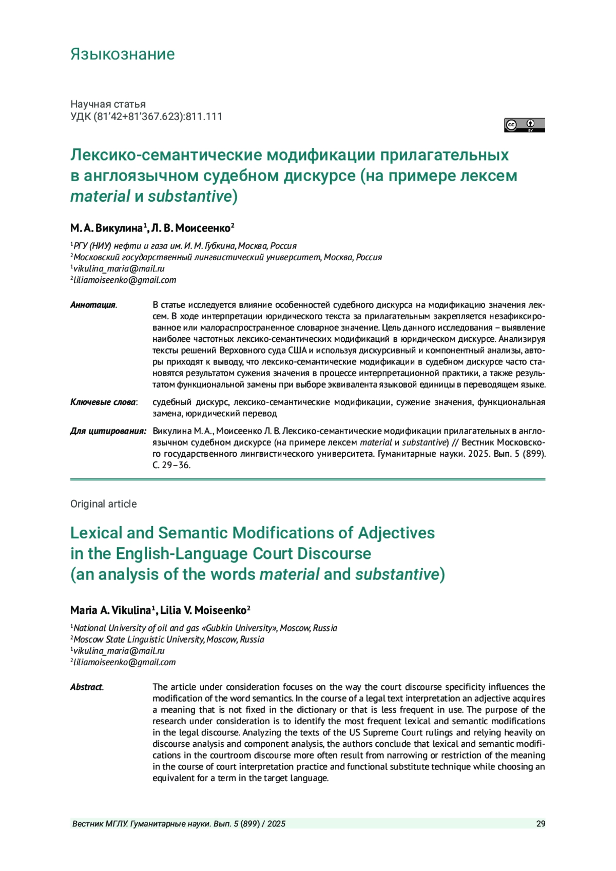 5. Викулина М. А. Лексико-семантические модификации экспрессивно-оценочных лексем в англоязычном правовом дискурсе (на примере прилагательного disparate) // Вестник Московского государственного лингвистического университета. Гуманитарные науки. 2018. № 9 (801). С. 91-101. EDN: YWLTXV