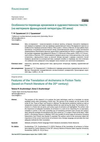 ГРУШЕВСКАЯ Т. М., ГРУШЕВСКАЯ Е. С. ОСОБЕННОСТИ ПЕРЕВОДА АРХАИЗМОВ В ХУДОЖЕСТВЕННОМ ТЕКСТЕ (НА МАТЕРИАЛЕ ФРАНЦУЗСКОЙ ЛИТЕРАТУРЫ XX ВЕКА) // ВЕСТНИК МОСКОВСКОГО ГОСУДАРСТВЕННОГО ЛИНГВИСТИЧЕСКОГО УНИВЕРСИТЕТА. ГУМАНИТАРНЫЕ НАУКИ. 2025. № 5 (899)