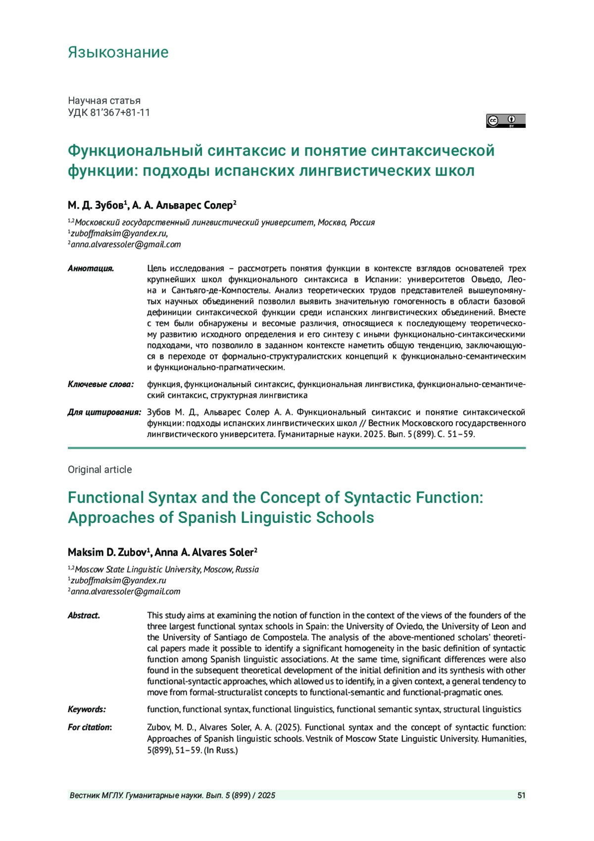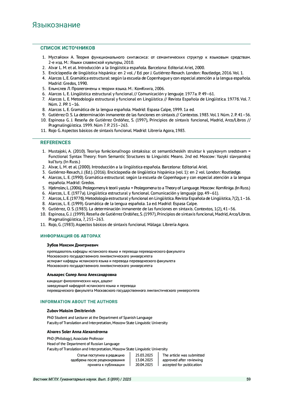 ЗУБОВ М. Д., АЛЬВАРЕС С. А. ФУНКЦИОНАЛЬНЫЙ СИНТАКСИС И ПОНЯТИЕ СИНТАКСИЧЕСКОЙ ФУНКЦИИ: ПОДХОДЫ ИСПАНСКИХ ЛИНГВИСТИЧЕСКИХ ШКОЛ // ВЕСТНИК МОСКОВСКОГО ГОСУДАРСТВЕННОГО ЛИНГВИСТИЧЕСКОГО УНИВЕРСИТЕТА. ГУМАНИТАРНЫЕ НАУКИ. 2025. № 5 (899)