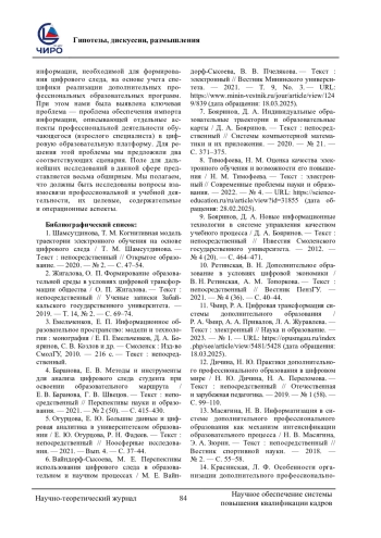 11. Чмир, Р. А. Цифровая трансформация системы дополнительного образования / Р. А. Чмир, А. А. Привалов, Л. А. Журавлева. - Текст: электронный // Наука и образование. - 2023. - № 1. - URL: https://opusmgau.ru/index.php/see/article/view/5481/5428 (дата обращения: 18.03.2025).