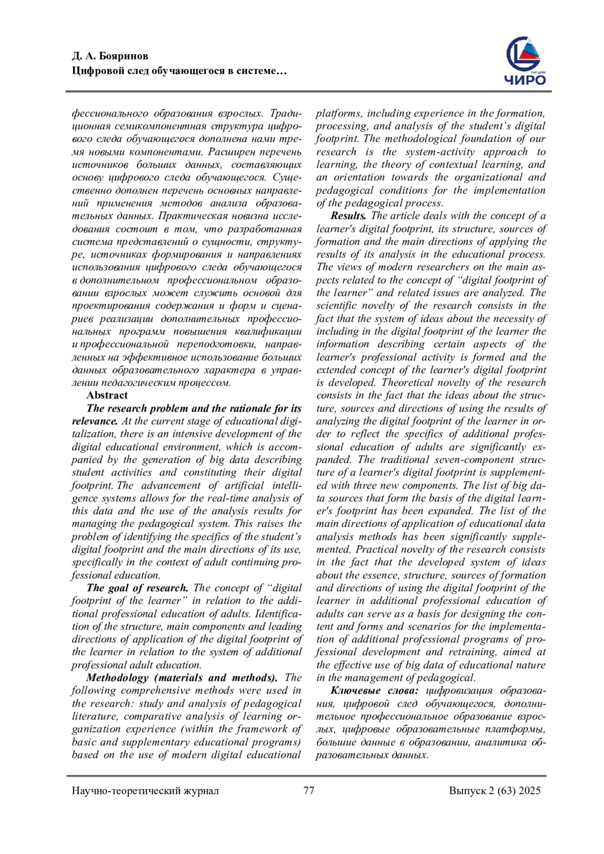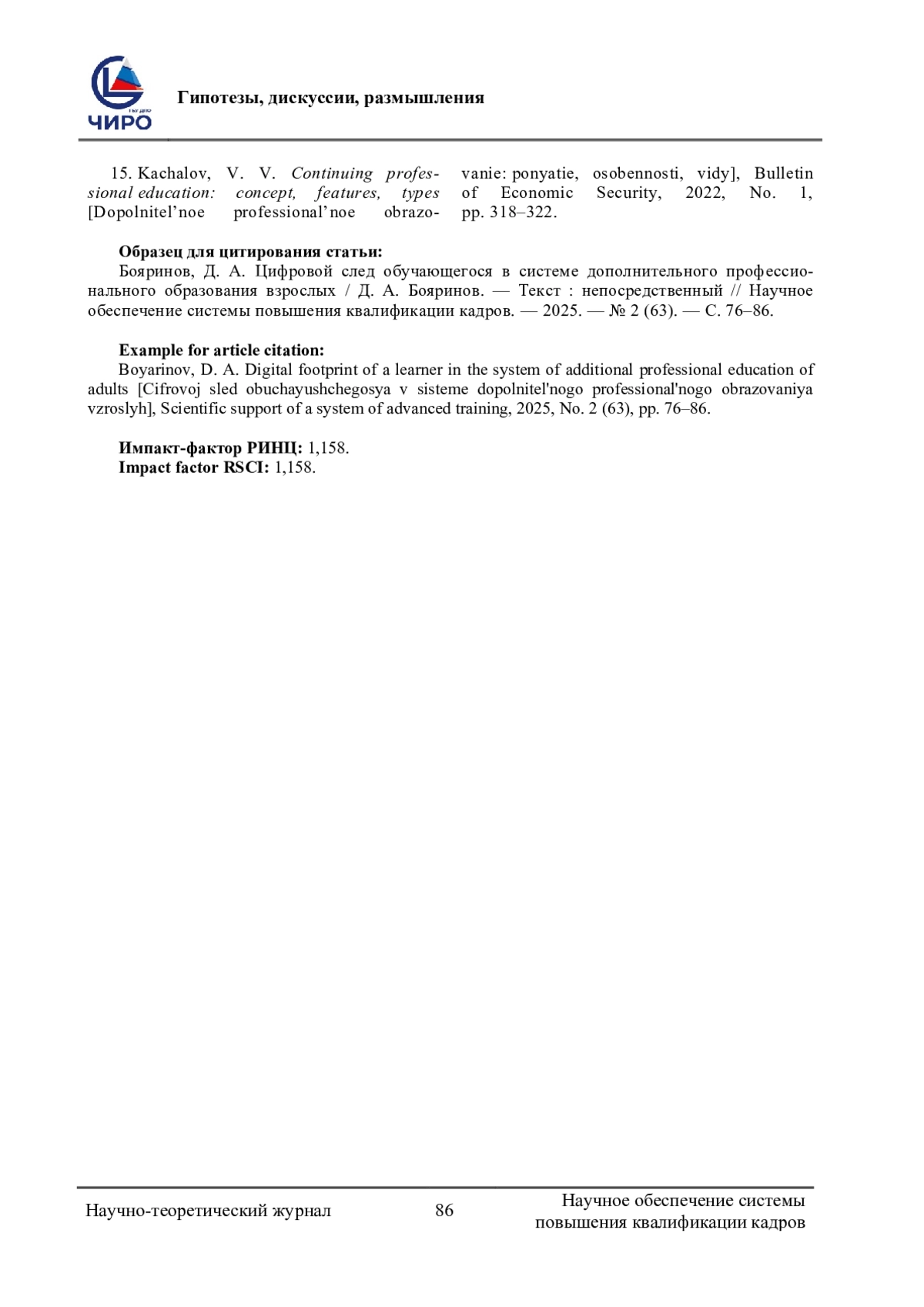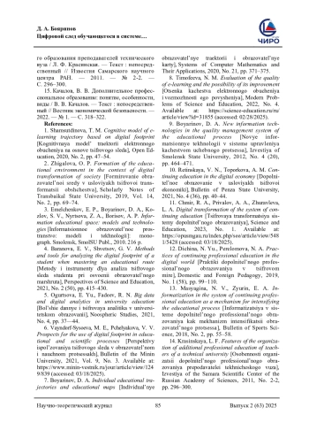 7. Бояринов, Д. А. Индивидуальные образовательные траектории и образовательные карты / Д. А. Бояринов. - Текст: непосредственный // Системы компьютерной математики и их приложения. - 2020. - № 21. - C. 371-375. EDN: YHEQZU