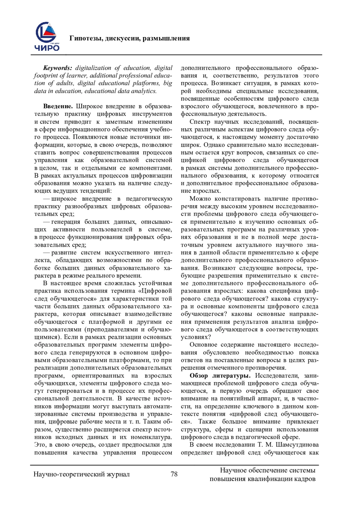 Проблема исследования и обоснование ее актуальности. На современном этапе процесса цифровизации образования происходит интенсивное развитие цифрового образовательного пространства, что сопровождается генерацией больших данных, описывающих действия обучающегося и составляющие его цифровой след. Развитие систем искусственного интеллекта позволяет анализировать эти данные в режиме реального времени и использовать результаты анализа для управления педагогической системой. Возникает проблема выявления специфики цифрового следа обучающегося и основных направлений его использования применительно к системе дополнительного профессионального образования взрослых. Цель исследования. Определение содержания понятия «цифровой след обучающегося» применительно к дополнительному профессиональному образованию взрослых. Выявление структуры, основных компонентов и ведущих направлений применения цифрового следа обучающегося применительно к системе дополнительного профессионального образования взрослых. Методология (материалы и методы) В исследовании были использованы следующие комплексные методы: изучение и анализ педагогической литературы, сравнительный анализ опыта организации обучения (в рамках основных и дополнительных учебных программ), основанного на использовании современных цифровых образовательных платформ, в том числе опыта формирования, обработки и анализа цифрового следа обучающегося. Методологической основой нашего исследования является системно-деятельностный подход в обучении, теория контекстного обучения и ориентация на организационно-педагогические условия реализации педагогического процесса. Результаты. В статье рассматриваются понятие цифрового следа обучающегося, его структура, источники формирования и основные направления применения результатов его анализа в учебном процессе. Анализируются взгляды современных исследователей на основные аспекты, связанные с понятием «цифровой след обучающегося» и связанные с ними вопросы. Научная новизна исследования состоит в том, что сформирована система представлений о необходимости включения в цифровой след обучающегося информации, описывающей отдельные аспекты профессиональной деятельности обучающегося и разработано расширенное понятие цифрового следа обучающегося. Теоретическая новизна исследования состоит в том, что существенно расширены представления о структуре, источниках и направлениях использования результатов анализа цифрового следа обучающегося с целью отражения специфики дополнительного профессионального образования взрослых. Традиционная семикомпонентная структура цифрового следа обучающегося дополнена нами тремя новыми компонентами. Расширен перечень источников больших данных, составляющих основу цифрового следа обучающегося. Существенно дополнен перечень основных направлений применения методов анализа образовательных данных. Практическая новизна исследования состоит в том, что разработанная система представлений о сущности, структуре, источниках формирования и направлениях использования цифрового следа обучающегося в дополнительном профессиональном образовании взрослых может служить основой для проектирования содержания и форм и сценариев реализации дополнительных профессиональных п