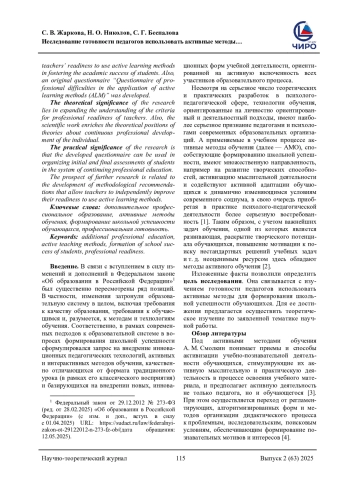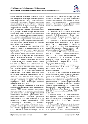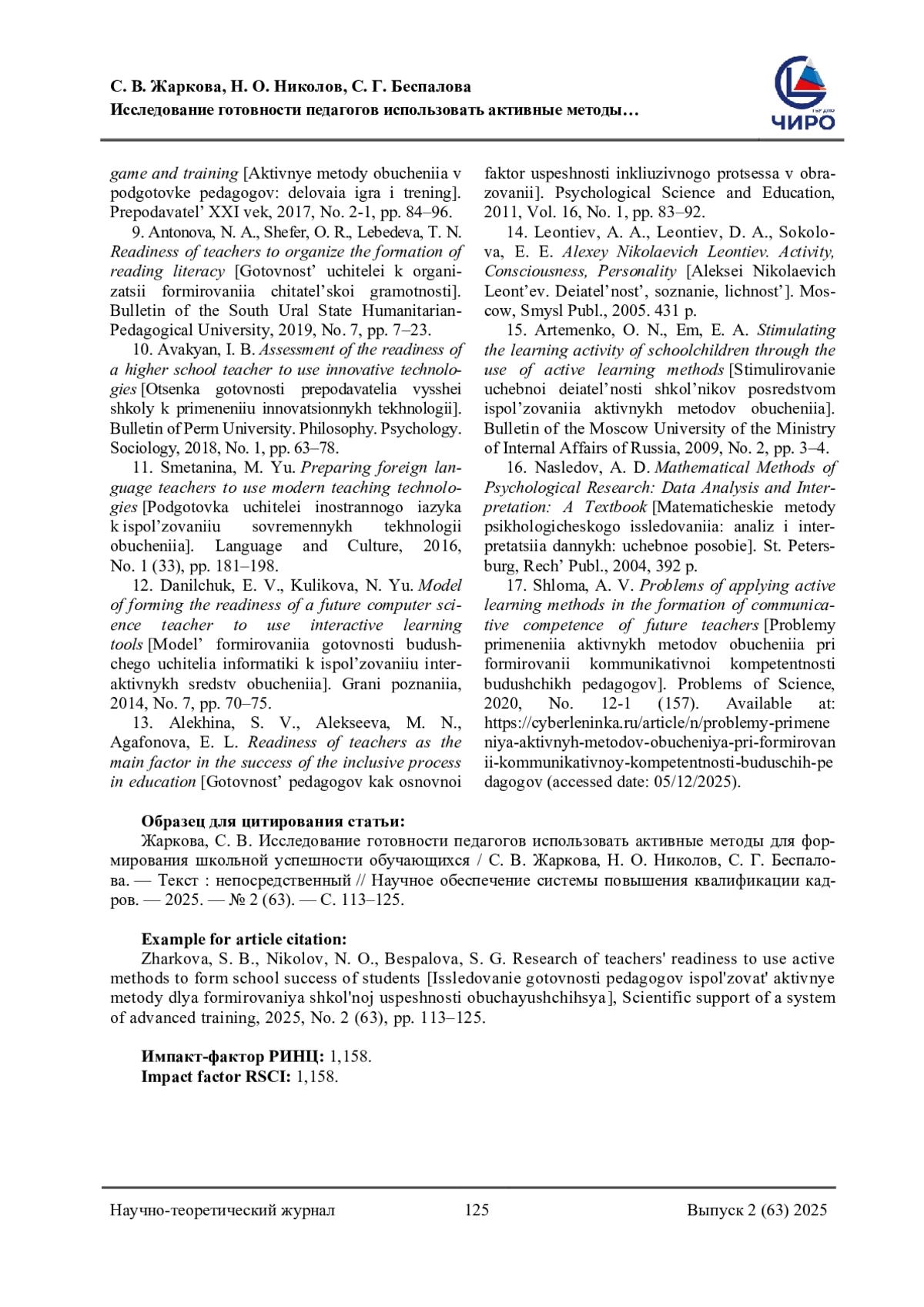 ЖАРКОВА С. В., НИКОЛОВ Н. О., БЕСПАЛОВА С. Г. ИССЛЕДОВАНИЕ ГОТОВНОСТИ ПЕДАГОГОВ ИСПОЛЬЗОВАТЬ АКТИВНЫЕ МЕТОДЫ ДЛЯ ФОРМИРОВАНИЯ ШКОЛЬНОЙ УСПЕШНОСТИ ОБУЧАЮЩИХСЯ // НАУЧНОЕ ОБЕСПЕЧЕНИЕ СИСТЕМЫ ПОВЫШЕНИЯ КВАЛИФИКАЦИИ КАДРОВ. 2025. № 2 (63) (14 СТ.)