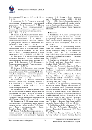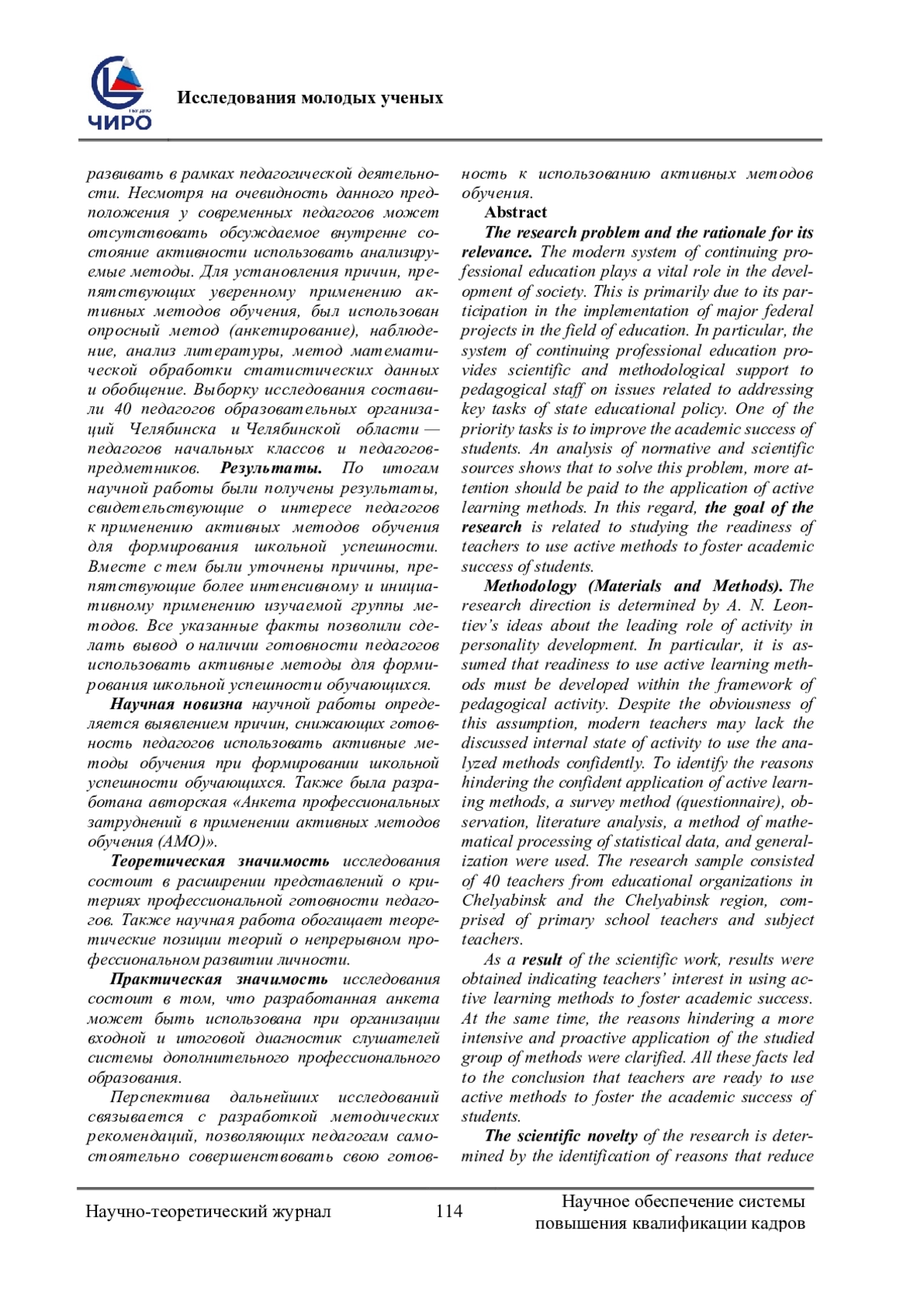 Проблема исследования и обоснование ее актуальности. Современная система дополнительного профессионального образования играет важную роль в развитии социума. В первую очередь речь идет об ее участии в реализации крупных федеральных проектов в области образования. В частности, в рамках системы дополнительного профессионального образования осуществляется научно-методическое сопровождения педагогических работников по вопросам решения ключевых задач государственной образовательной политики. Одной из приоритетных задач является повышение школьной успешности обучающихся. Анализ нормативных и научных источников показывает, что для ее решения следует больше внимания уделять применению активных методов обучения. В этой связи ставится цель исследования, связанная с изучением готовности педагогов использовать активные методы для формирования школьной успешности обучающихся. Методология (материалы и методы). Направление исследования определяется идеями А. Н. Леонтьева о ведущей роли деятельности в развитии личности. В частности, предполагается, что готовность к применению активных методов обучения необходимо развивать в рамках педагогической деятельности. Несмотря на очевидность данного предположения у современных педагогов может отсутствовать обсуждаемое внутренне состояние активности использовать анализируемые методы. Для установления причин, препятствующих уверенному применению активных методов обучения, был использован опросный метод (анкетирование), наблюдение, анализ литературы, метод математической обработки статистических данных и обобщение. Выборку исследования составили 40 педагогов образовательных организаций Челябинска и Челябинской области - педагогов начальных классов и педагогов-предметников. Результаты. По итогам научной работы были получены результаты, свидетельствующие о интересе педагогов к применению активных методов обучения для формирования школьной успешности. Вместе с тем были уточнены причины, препятствующие более интенсивному и инициативному применению изучаемой группы методов. Все указанные факты позволили сделать вывод о наличии готовности педагогов использовать активные методы для формирования школьной успешности обучающихся. Научная новизна научной работы определяется выявлением причин, снижающих готовность педагогов использовать активные методы обучения при формировании школьной успешности обучающихся. Также была разработана авторская «Анкета профессиональных затруднений в применении активных методов обучения (АМО)». Теоретическая значимость исследования состоит в расширении представлений о критериях профессиональной готовности педагогов. Также научная работа обогащает теоретические позиции теорий о непрерывном профессиональном развитии личности. Практическая значимость исследования состоит в том, что разработанная анкета может быть использована при организации входной и итоговой диагностик слушателей системы дополнительного профессионального образования. Перспектива дальнейших исследований связывается с разработкой методических рекомендаций, позволяющих педагогам самостоятельно совершенствовать свою готовность к использованию активных методов обучения.