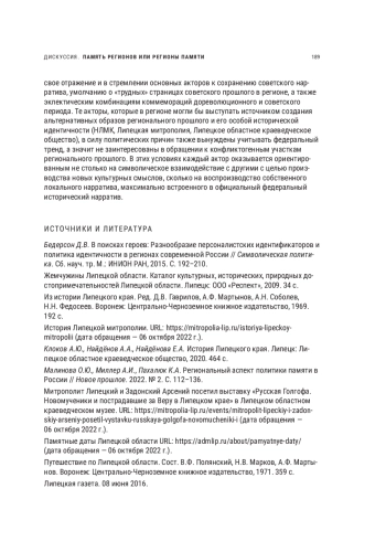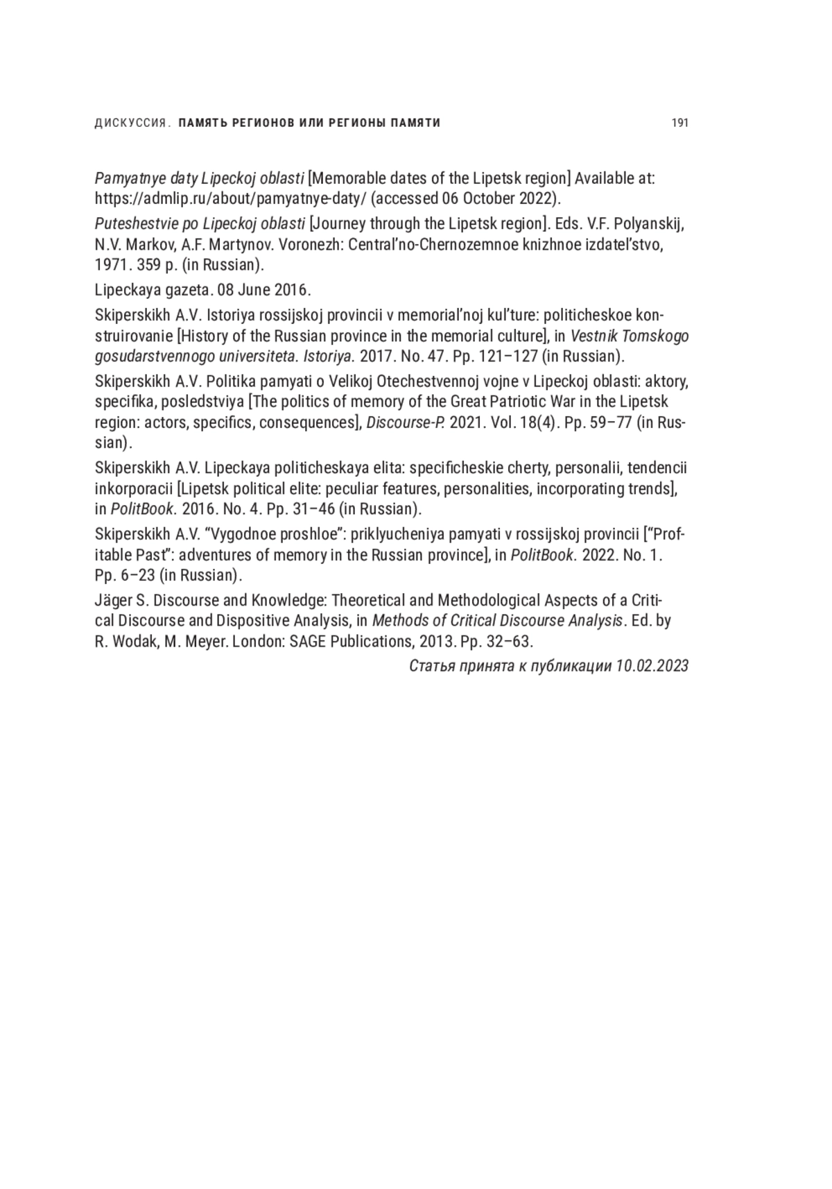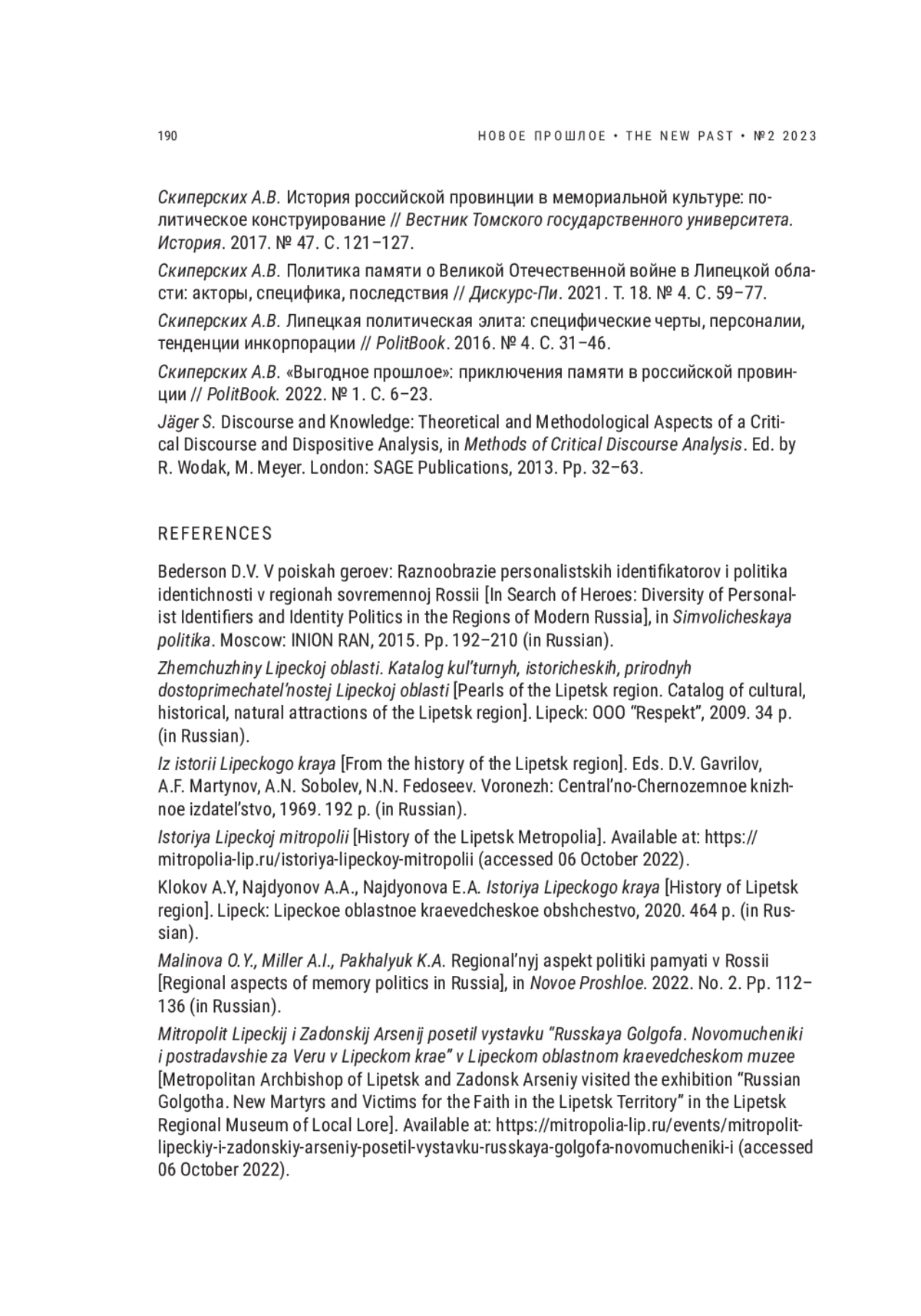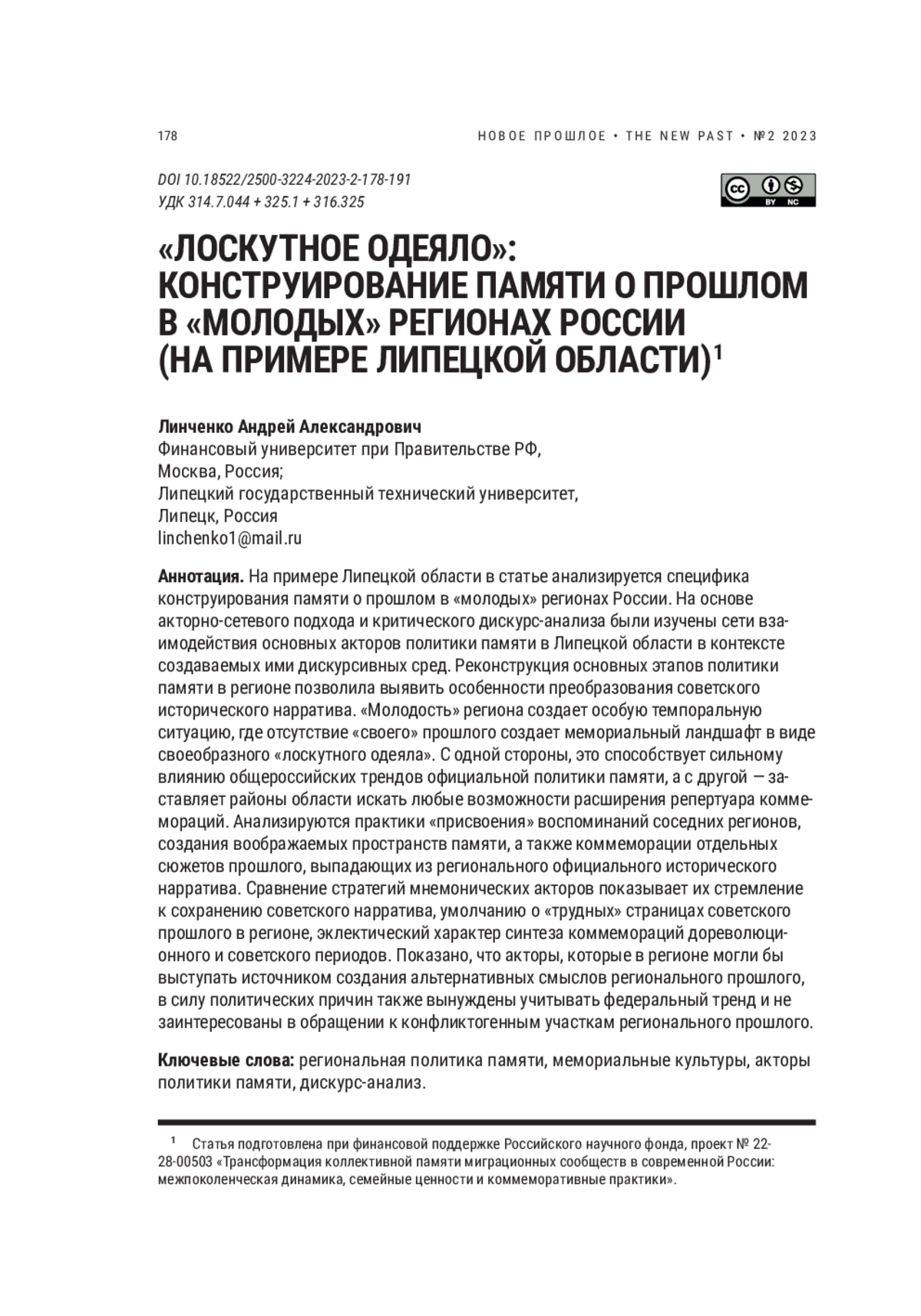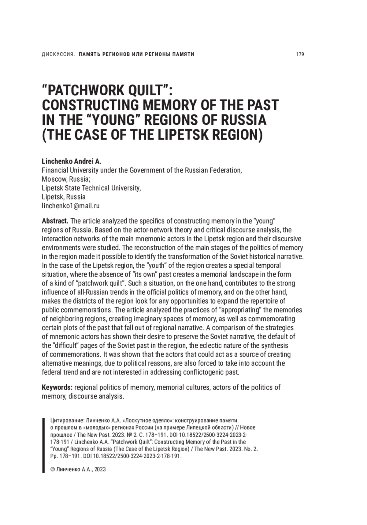 ЛИНЧЕНКО А. А. "ЛОСКУТНОЕ ОДЕЯЛО": КОНСТРУИРОВАНИЕ ПАМЯТИ О ПРОШЛОМ В " МОЛОДЫХ " РЕГИОНАХ РОССИИ ( НА ПРИМЕРЕ ЛИПЕЦКОЙ ОБЛАСТИ ) // НОВОЕ ПРОШЛОЕ. 2023. № 2