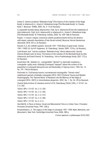 11. Павловский А.Ф. Культурная травма и современная историография: “Вторая волна” исследований памяти о блокаде Ленинграда (2016-2021) // Историческая экспертиза. 2022. № 1. С. 26-29.