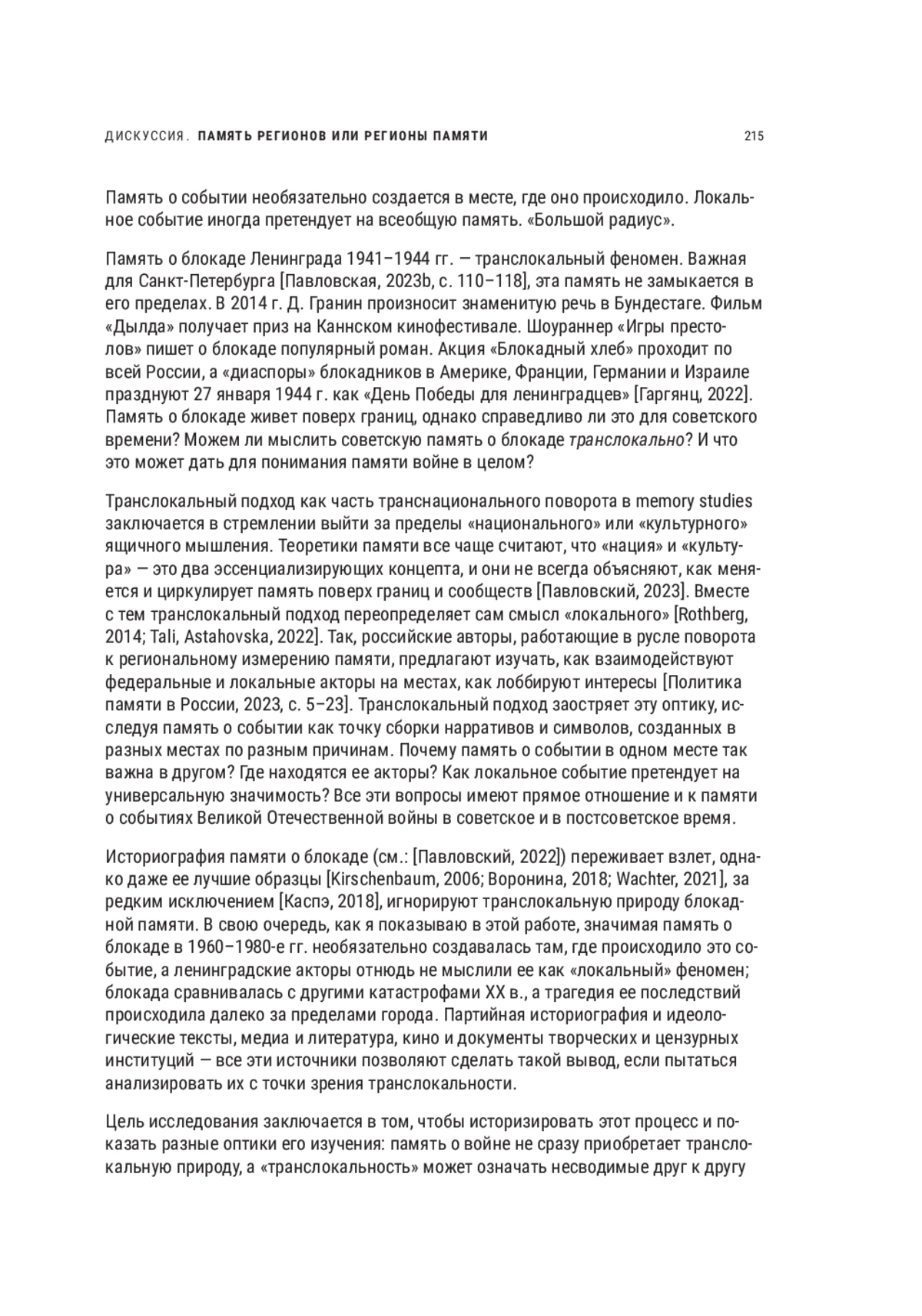 15. Павловская А.Ю. “Малый радиус” блокады Ленинграда: множественные локальности и гетеротопия памяти в “Блокадной книге” А. Адамовича и Д. Гранина // Новое прошлое. 2023. № 2.