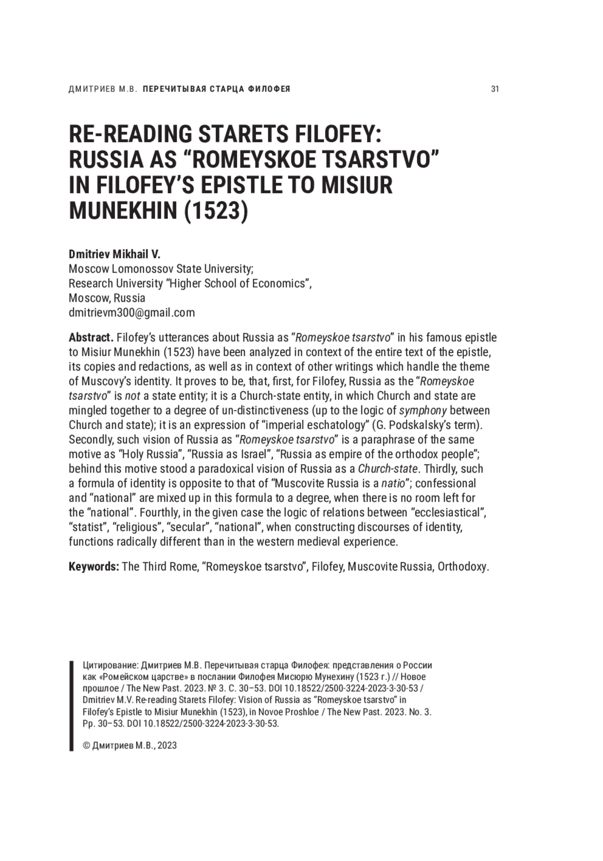 Настоящая статья обращена к вопросам, порождаемым внимательным и свободным от априорных допущений прочтением того, как в знаменитом послании старца Филофея Мисюрю Мунехину звучит мотив приравнения Русского государства к «Ромейскому царству». Что именно стоит за понятием «Ромейское царство» в этом послании? Соответственно, в каком именно смысле Русское государство было, согласно Филофею, «Ромейским царством»? Как в идеологической и ментальной системе представлений Филофея (и, видимо, его приобщенных к книжной культуре русских современников) о «Ромейском царстве» понималось соотношение светского и религиозного, государственного и церковного в устройстве Московской Руси? Наконец, была ли такая система мышления о Руси как «Ромейском царстве» «национальной», «протонациональной», «этнической»?