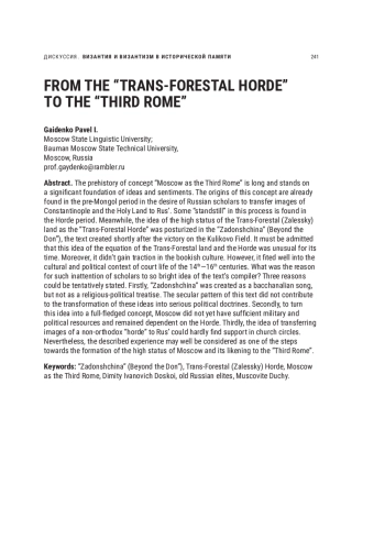 Предыстория возникновения концепции «Москва — Третий Рим» продолжительна и стоит на значительном фундаменте идей и настроений. Истоки данной концепции обнаруживаются уже в домонгольский период в стремлении русских книжников перенести на Русь образы Константинополя и Святой Земли. Некоторое «затишье» в этом процессе обнаруживается в Ордынский период. Между тем в «Задонщине», произведении, созданном вскоре после победы на Куликовом поле, была сформулирована идея высокого статуса Залесской земли, которая была наименована «ордой Залесской». Необходимо признать, что данная идея уравнения Залесской земли и Орды — необычна для своего времени. Более того, она не получила своего развития в книжной культуре. Однако она хорошо вписывалась в культурный и политический контекст придворной жизни XIV–XVI вв. Что стало причиной такого невнимания книжников к столь яркой мысли составителя произведения? Предварительно можно выделить три причины. Во-первых, «Задонщина» была создана как пиршественная песнь, а не в качестве религиозно-политического трактата. Светский характер произведения не способствовал превращению его идей в серьезные политические доктрины. Во-вторых, для превращения данной мысли в полноценную концепцию Москва не обладали еще достаточными военно-политическими ресурсами и оставалась зависимой от Орды. В-третьих, идея переноса образов иноверной «орды» на Русь едва ли могла встретить поддержку в церковных кругах. Тем не менее, описанный опыт вполне может рассматриваться в качестве одного из шагов на пути формирования высокого статуса Москвы и ее уподобления «Третьему Риму»