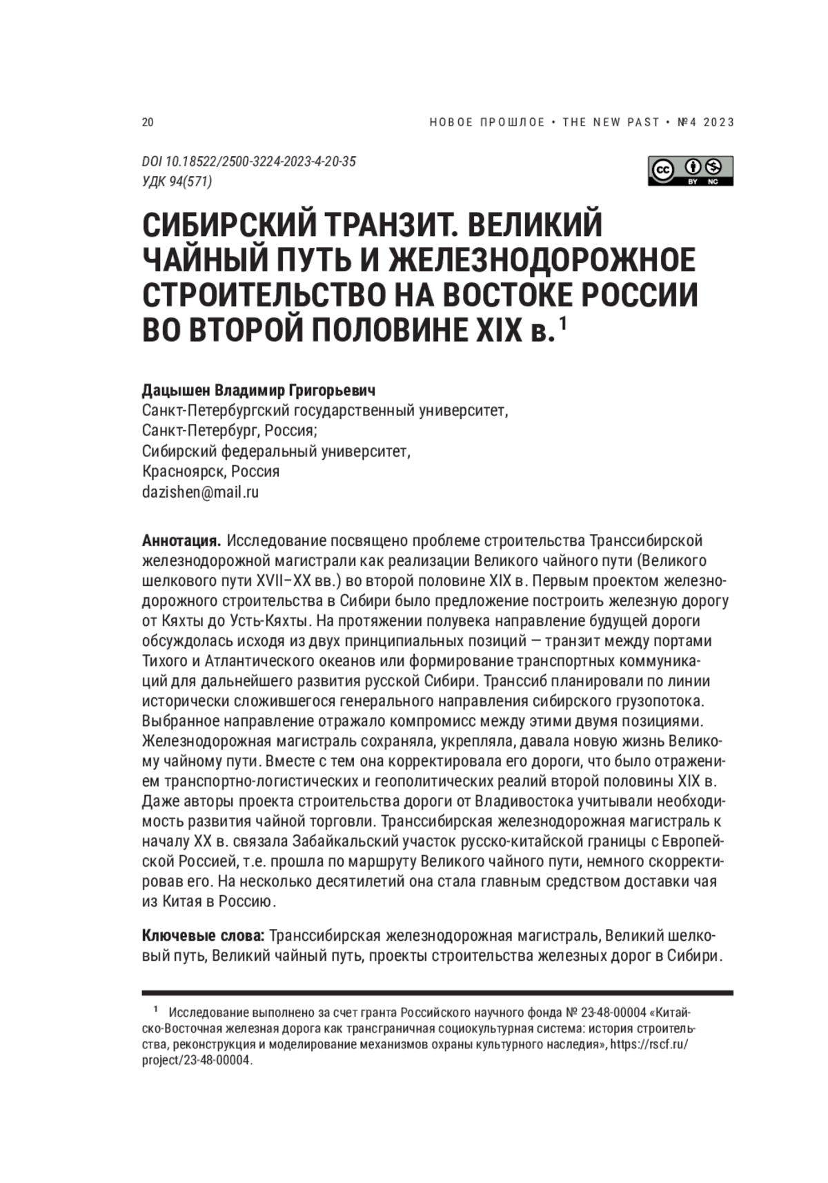 3. Дацышен В.Г. Из Сибири в Китай: к проблеме северного направления “Великого шелкового пути” в XVI-XVIII вв. // Великий Шелковый путь: культурное наследие и развитие контактов. Под ред. С.А. Комиссарова, Ю.А. Азаренко. Новосибирск: ИПЦ НГУ, 2020. С. 69-75.