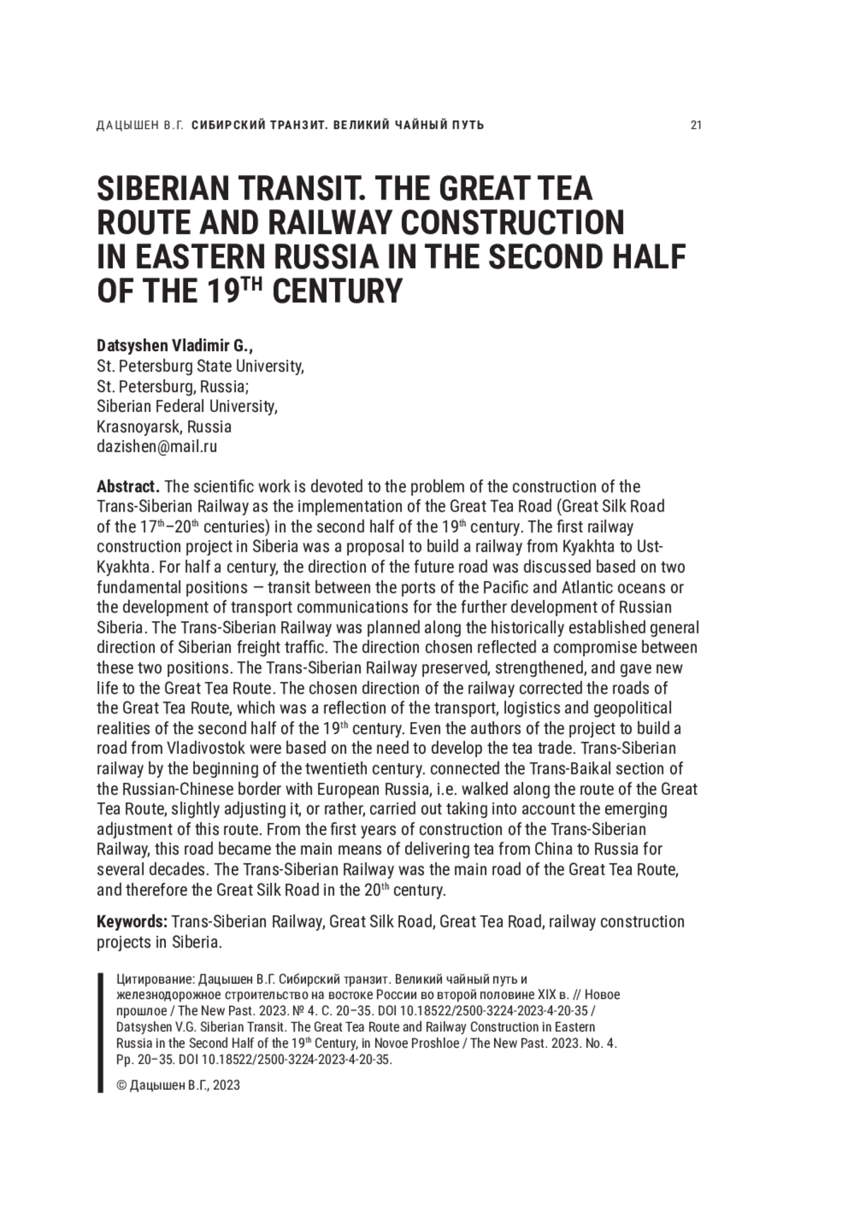 Исследование посвящено проблеме строительства Транссибирской железнодорожной магистрали как реализации Великого чайного пути (Великого шелкового пути XVII–ХХ вв.) во второй половине XIX в. Первым проектом железнодорожного строительства в Сибири было предложение построить железную дорогу от Кяхты до Усть-Кяхты. На протяжении полувека направление будущей дороги обсуждолась исходя из двух принципиальных позиций — транзит между портами Тихого и Атлантического океанов или формирование транспортных коммуникаций для дальнейшего развития русской Сибири. Транссиб планировали по линии исторически сложившегося генерального направления сибирского грузопотока. Выбранное направление отражало компромисс между этими двумя позициями. Железнодорожная магистраль сохраняла, укрепляла, давала новую жизнь Великому чайному пути. Вместе с тем она корректировала его дороги, что было отражением транспортно-логистических и геополитических реалий второй половины XIX в. Даже авторы проекта строительства дороги от Владивостока учитывали необходимость развития чайной торговли. Транcсибирская железнодорожная магистраль к началу ХХ в. связала Забайкальский участок русско-китайской границы с Европейской Россией, т. е. прошла по маршруту Великого чайного пути, немного скорректировав его. На несколько десятилетий она стала главным средством доставки чая из Китая в Россию