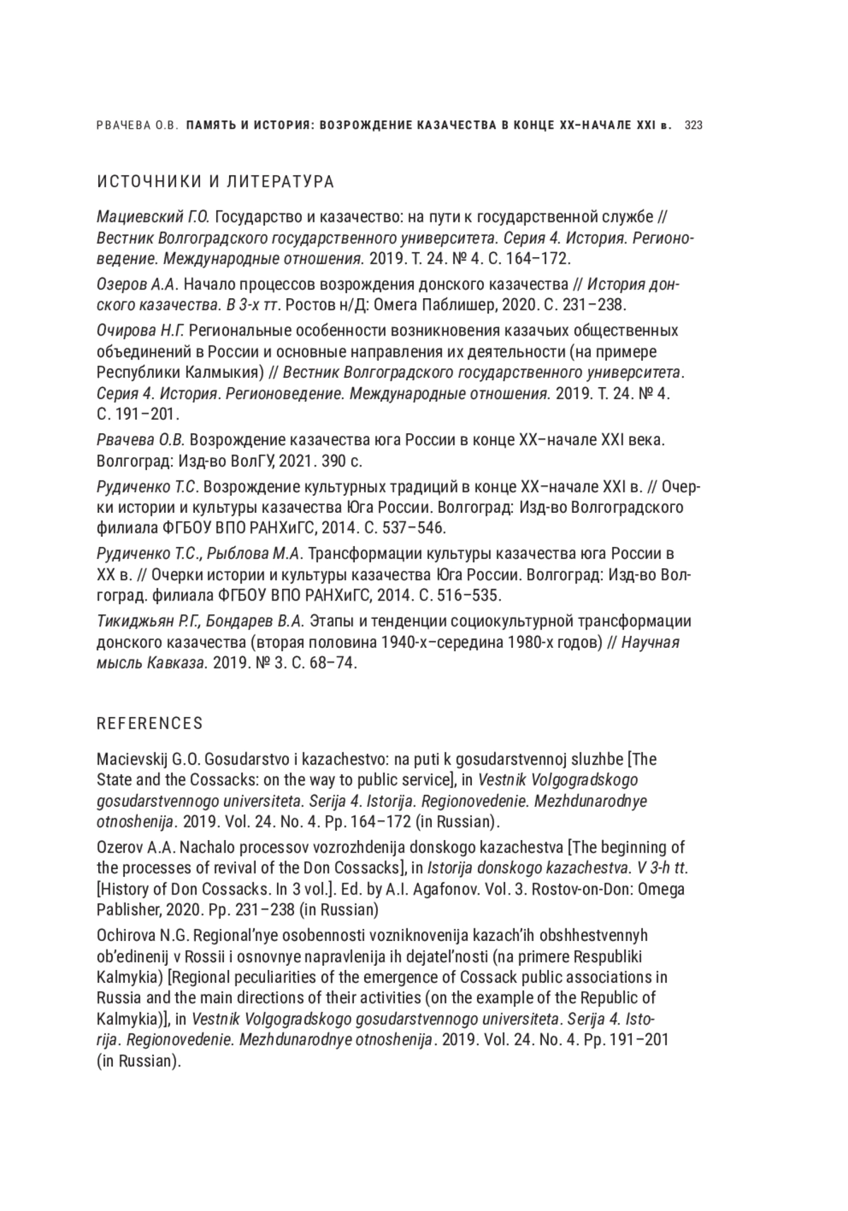 4. Рвачева О.В. Возрождение казачества юга России в конце XX - начале XXI века. Волгоград: Изд-во ВолГУ, 2021. 390 с.