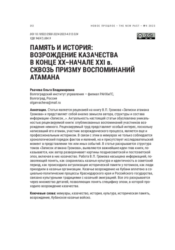 Статья является рецензией на книгу В. П. Громова «Записки атамана Громова» и представляет собой анализ замысла автора, структуры и состава информации «Записок…». Актуальность настоящей статьи обусловлена уникальностью рецензируемой книги: опубликованных воспоминаний участников возрождения немного. Рецензируемый труд представляет особый интерес, поскольку написавший его атаман, участник возрожденческого процесса, является еще и профессиональным историком. В связи с этим в мемуарах не только соблюдается хронологический порядок фактов и явлений, но и присутствует исследовательский момент в представлении тех или иных событий. В статье раскрывается структура томов «Записок атамана Громова», выявляются важнейшие идеи глав книги, показывается, как автор разворачивает картины позднесоветской и постсоветской эпох, включая в них казачество. Работа В. П. Громова насыщена информацией, позволяющей понять, как сохранялась казачья культура и идентичность в советский период, как происходила актуализация исторической памяти у потомков, как люди приходили в казачьи организации. Казачье возрождение на Кубани вплетено в социально-политические процессы Краснодарского края и Российского государства, связано культурными традициями с казачьей эмиграцией. Все это раскрывается через множество деталей, позволяющих понять специфику эпохи, в которой проходило возрождение казачества