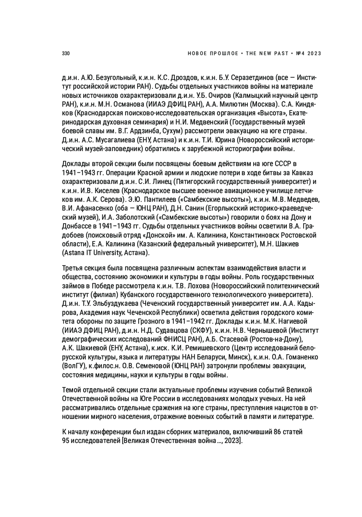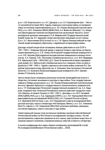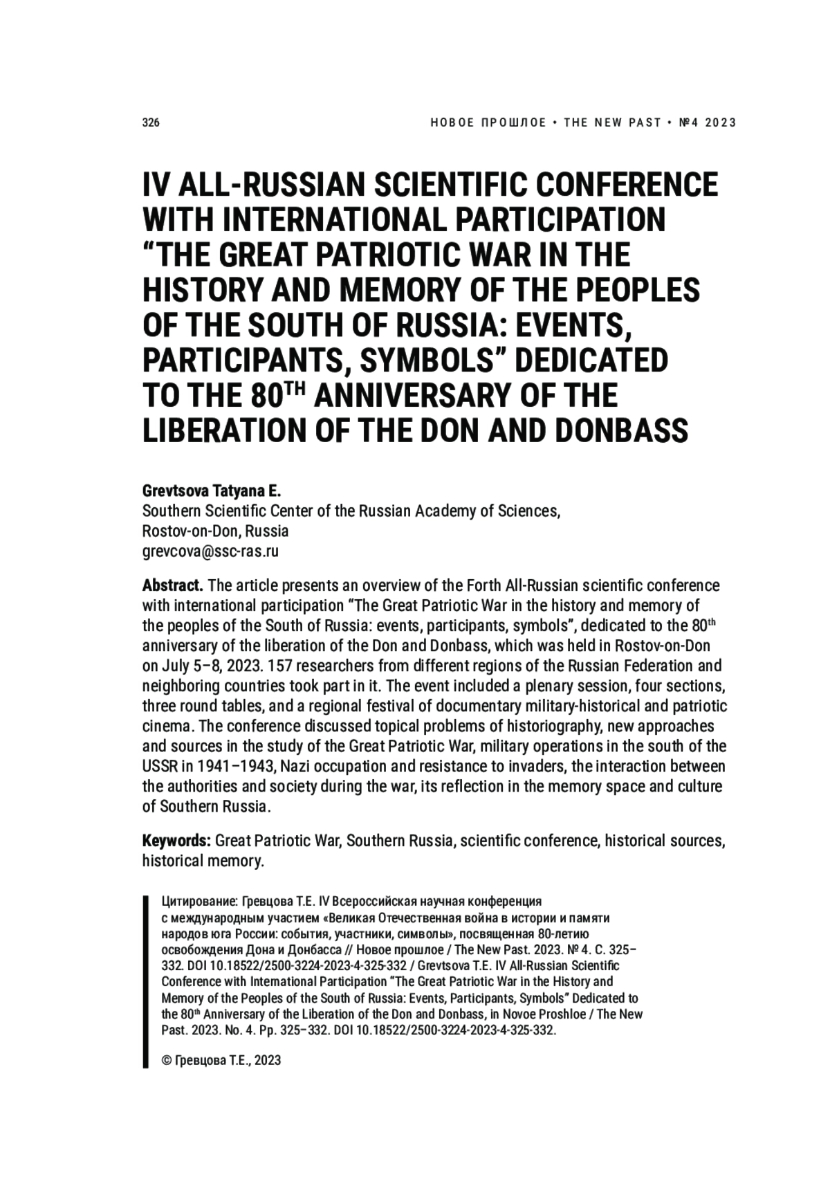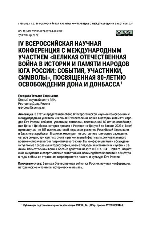 В статье представлен обзор IV Всероссийской научной конференции с международным участием «Великая Отечественная война в истории и памяти народов Юга России: события, участники, символы», посвященной 80-летию освобождения Дона и Донбасса, которая прошла в Ростове-на-Дону с 5 по 8 июля 2023 г. В ней приняли участие 157 исследователей из разных регионов Российской Федерации и ближнего зарубежья. В рамках мероприятия состоялись пленарное заседание, четыре секции, три круглых стола и региональный фестиваль документального военно-исторического и патриотического кино. На конференции были обсуждены актуальные проблемы историографии, новые подходы и источники в изучении Великой Отечественной войны, боевые действия на юге СССР в 1941–1943 гг., нацистская оккупация и сопротивление захватчикам, взаимодействие власти и общества в годы войны, ее отражение в пространстве памяти и культуре Юга России