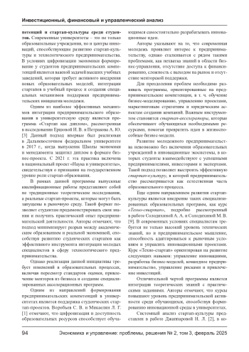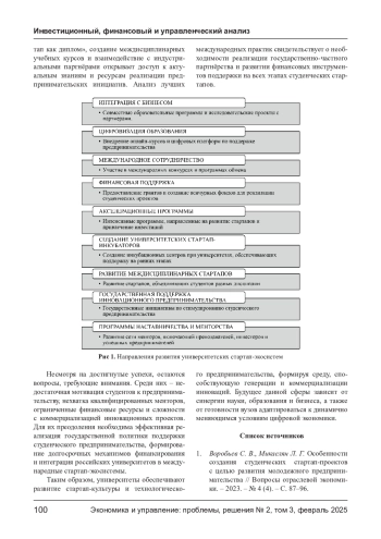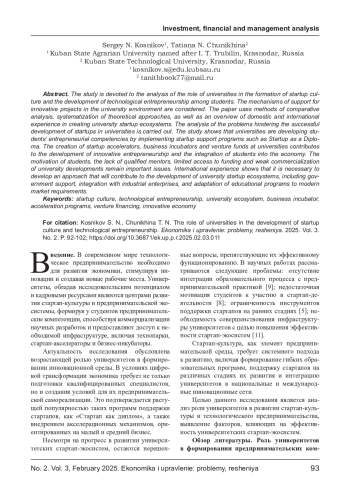 Исследование посвящено анализу роли университетов в формировании стартапкультуры и развитии технологического предпринимательства среди студентов. Рассматриваются механизмы поддержки инновационных проектов в университетской среде. В работе использованы методы сравнительного анализа, систематизации теоретических подходов, а также обзор отечественного и международного опыта по созданию университетских стартап-экосистем. Проведен анализ проблем, препятствующих успешному развитию стартапов в университетах. Исследование показывает, что университеты развивают предпринимательские компетенции студентов путем внедрения таких программ поддержки стартапов, как «Стартап как диплом». Создание стартап-акселераторов, бизнес-инкубаторов и венчурных фондов при университетах способствует развитию инновационного предпринимательства и интеграции студентов в экономику. Важными вопросами остается мотивация студентов, нехватка квалифицированных менторов, ограниченный доступ к финансированию и слабая коммерциализация университетских разработок. Международный опыт показывает, что необходимо выработать такой подход, который будет способствовать развитию университетских стартап-экосистем, включающий государственную поддержку, интеграцию с промышленными предприятиями и адаптацию образовательных программ к современным требованиям рынка.