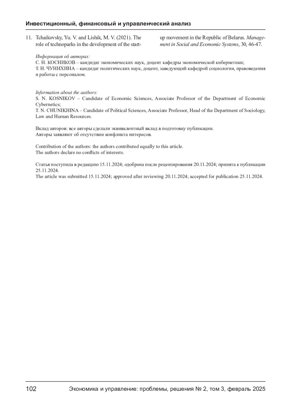 11. Чайковская Ю. В., Лишик М. В. Роль технопарков в развитии стартап-движения в Республике Беларусь // Управление в социальных и экономических системах. - 2021. - № 30. - С. 46-47. EDN: KTCVQS