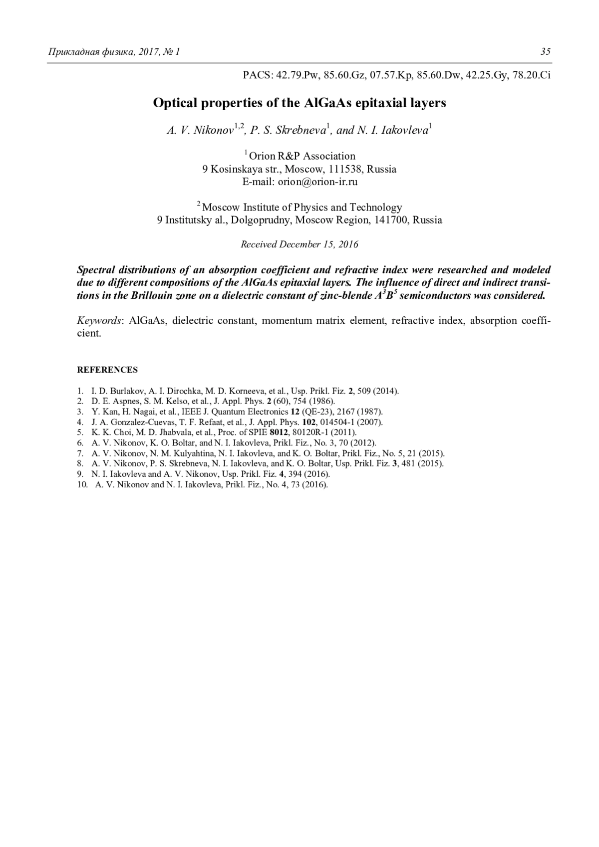 A. V. Nikonov, P. S. Skrebneva, and N. I. Iakovleva Optical properties of the AlGaAs epitaxial layers 31