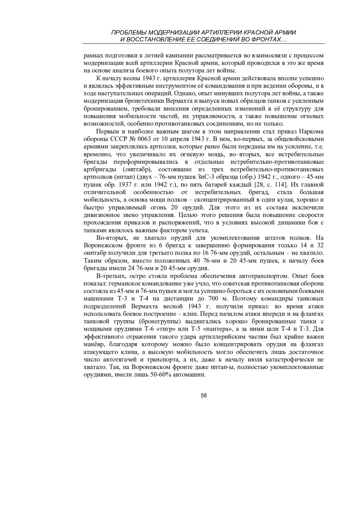 После стабилизации фронта в марте 1943 года важнейшей задачей для руководства СССР в рамках подготовки летней кампании стала разработка и реализация мер, с учетом боевого опыта, по совершенствование организационно-штатной структуры артиллерии и обеспечение ее новыми образцами вооружения как одного из ключевых элементов при решении масштабных задач и в обороне и в наступлении. В статье на широкой базе архивного материала представлены решения и деятельность военно-политического руководства СССР по данному вопросу, а также анализируется состояние и численность артиллерии фронтов, действовавших в Курской дуге к началу июля 1943 г. Приведённый статистический материал управлений командующих артиллерией и отдела укомплектования Центрального и Воронежского фронтов, также позволяет установить численность их артиллерийских группировок и плотность артиллерии на участках, где 5 июля 1943 г. Вермахт нанес удары, дать оценку прогнозу советского командования при разработке Курской оборонительной операции.