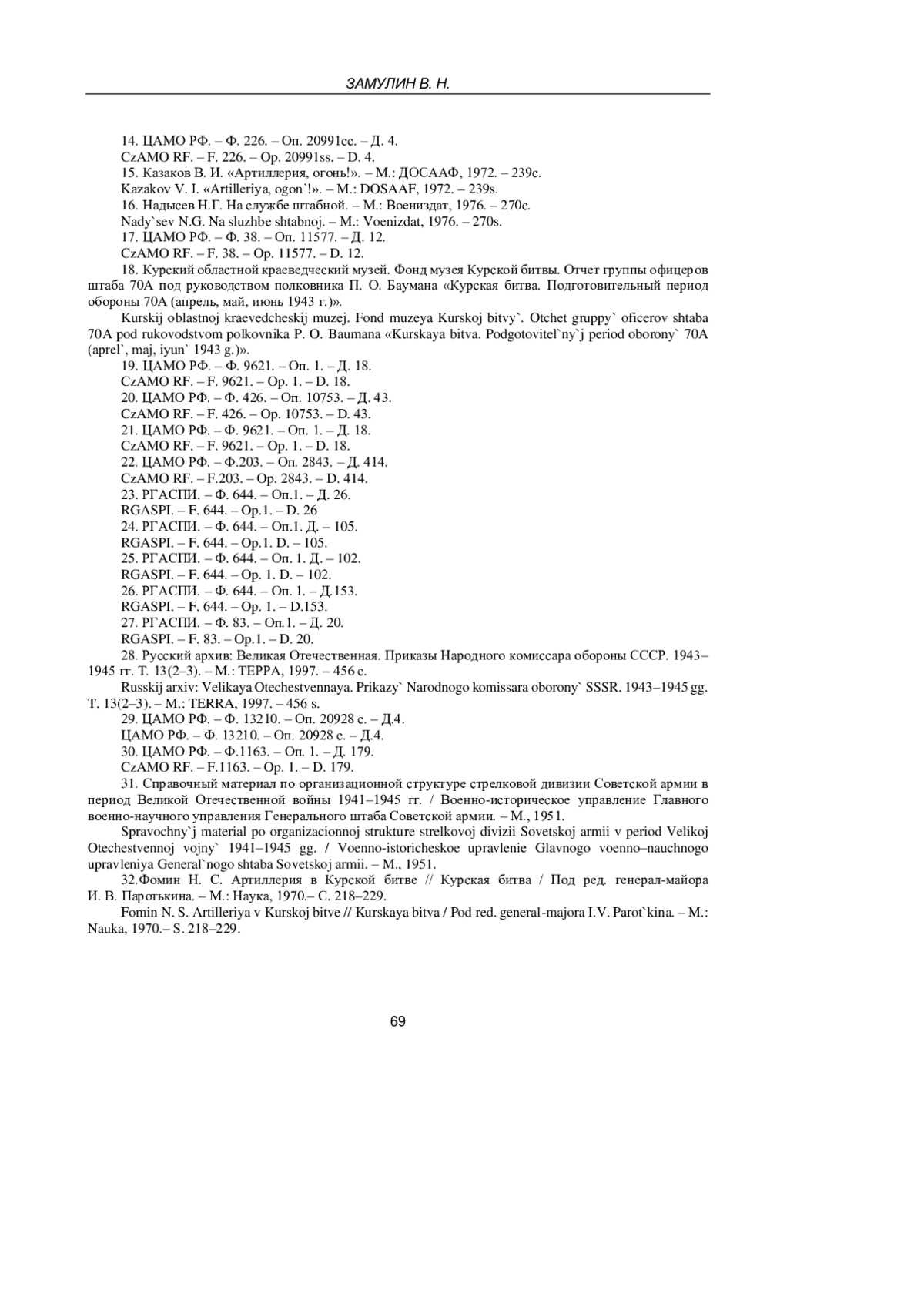 32. Фомин Н. С. Артиллерия в Курской битве // Курская битва / Под ред. генерал-майора И. В. Паротькина. - М.: Наука, 1970.- С. 218-229.