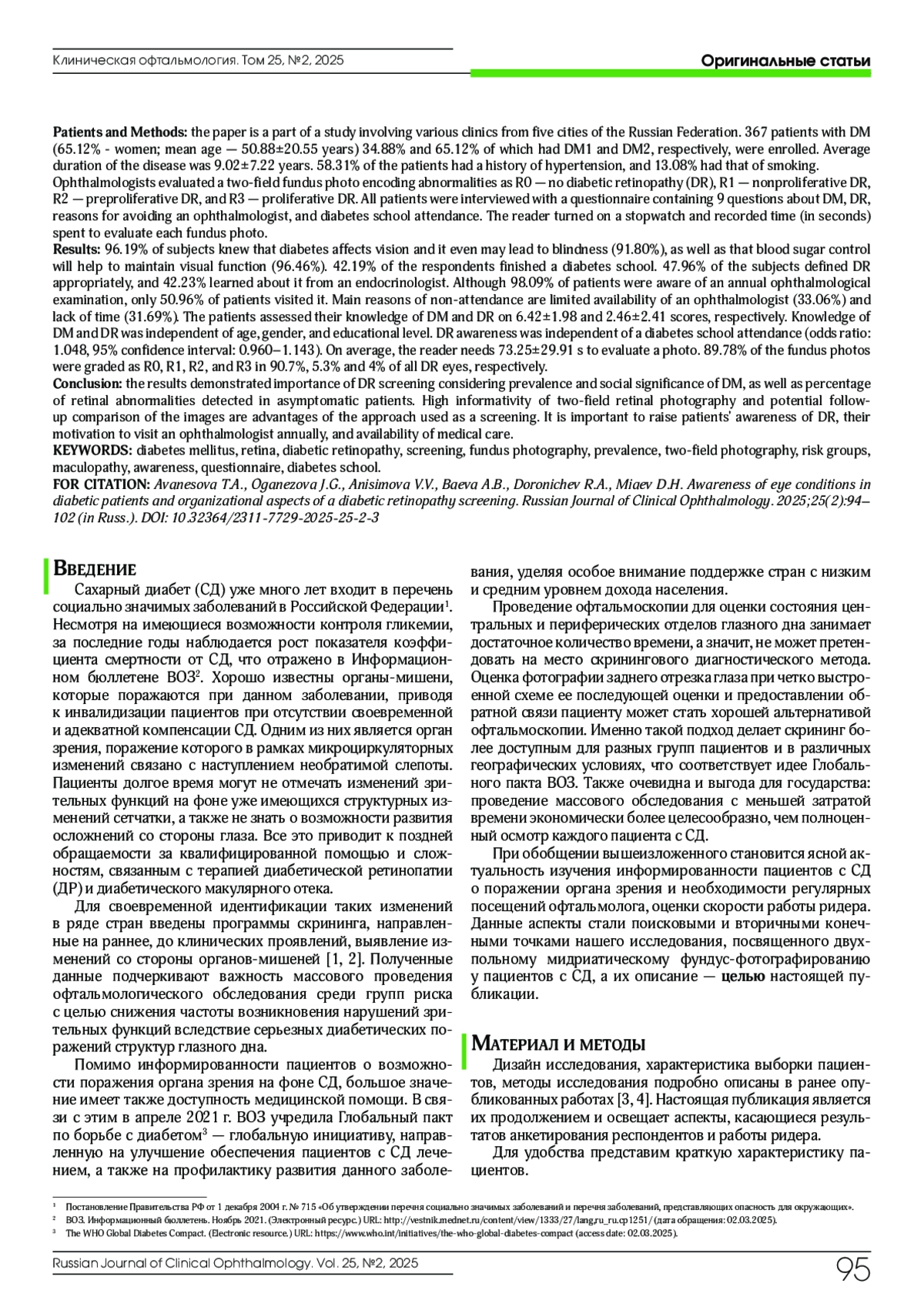 Avanesova T.A., Oganezova J.G., Anisimova V.V. et al. Prevalence of diabetic retinopathy assessed using two-field mydriatic fundus photography.Russian Annals of Ophthalmology. 20243;140(4):58-65 (in Russ.). DOI: 10.17116/oftalma202414004158