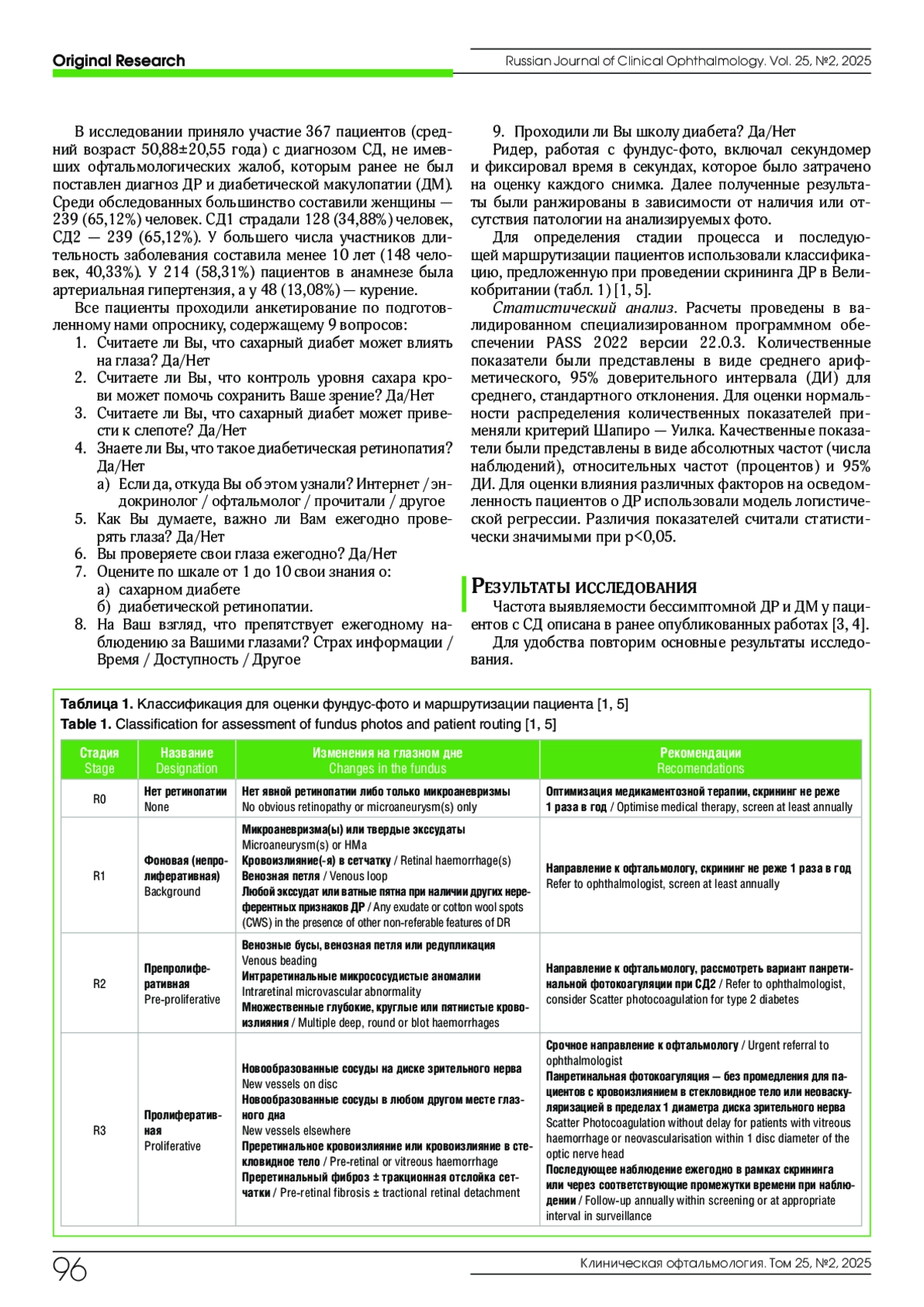 Материал и методы: настоящая работа является частью исследования, в котором приняли участие клиники из пяти городов Российской Федерации. Включено 367 пациентов с СД (65,12% женщин; средний возраст 50,88±20,55 года), из них 34,88% с СД1, 65,12% — с СД2. Средняя длительность заболевания составила 9,02±7,22 года. У 58,31% пациентов в анамнезе была артериальная гипертензия, у 13,08% — курение. Офтальмологи оценивали двухпольное фундус-фото, шифруя изменения как R0 — диабетической ретинопатии (ДР) нет, R1 — непролиферативная ДР, R2 — препролиферативная ДР, R3 — пролиферативная ДР. Все пациенты проходили анкетирование по опроснику, содержащему 9 вопросов о СД, ДР, причинах непосещения офтальмолога и прохождении школы диабета. Ридер включал секундомер и фиксировал время в секундах, затраченное на оценку каждого фундус-фото.