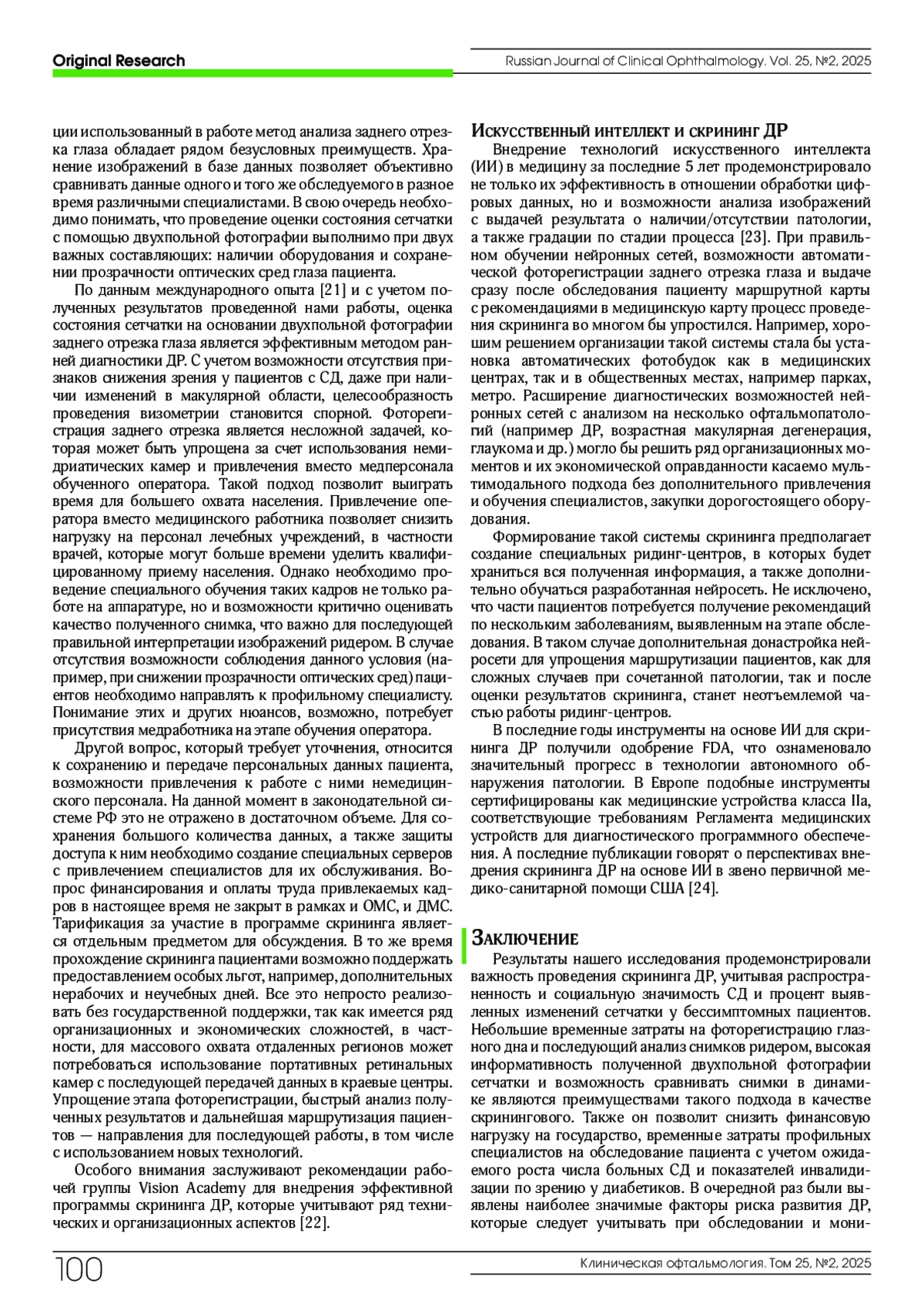 Заключение: результаты продемонстрировали важность проведения скрининга ДР, учитывая распространенность и социальную значимость СД и процент выявленных изменений сетчатки у бессимптомных пациентов. Высокая информативность двухпольной фотографии сетчатки и возможность сравнивать снимки в динамике являются преимуществами такого подхода в качестве скринингового. Важно повышать осведомленность пациентов о ДР, их мотивацию к ежегодному посещению офтальмолога, доступность медицинской помощи.