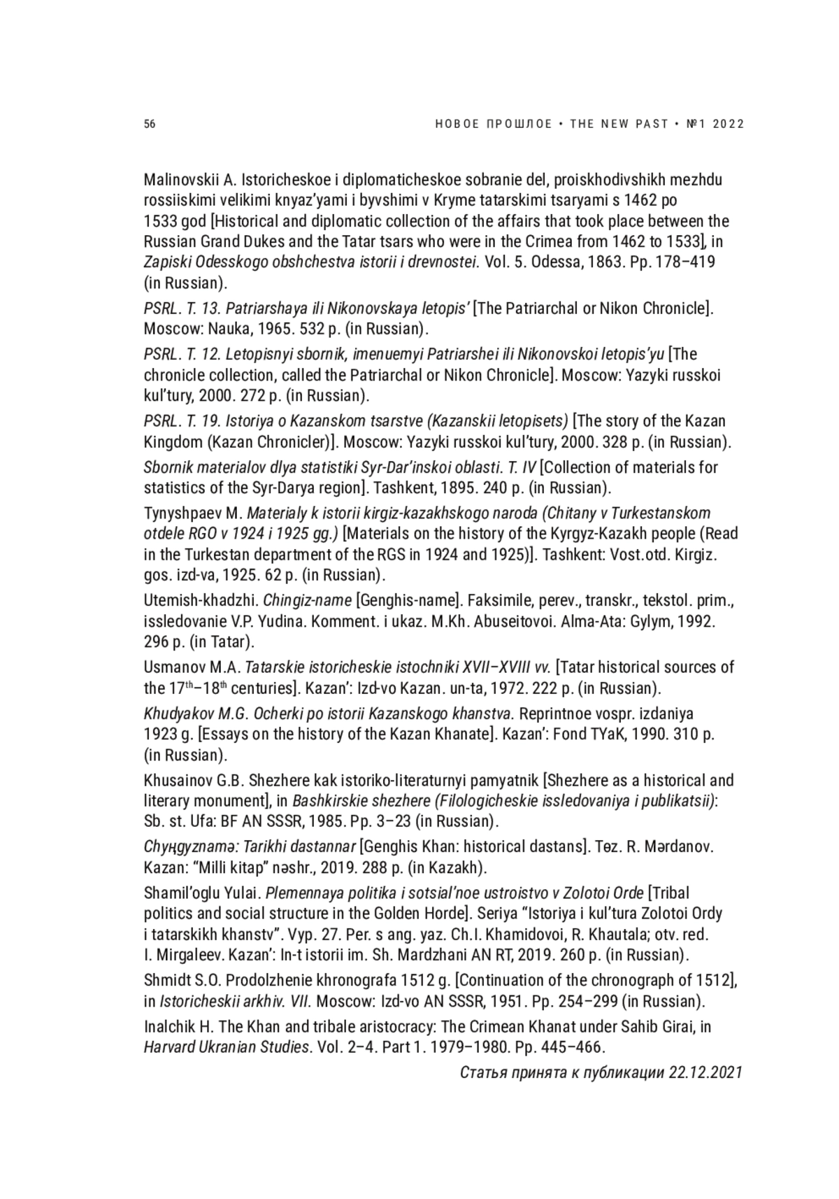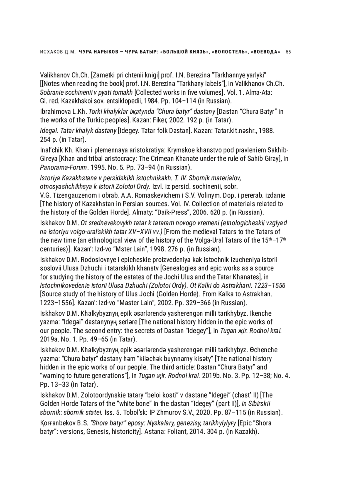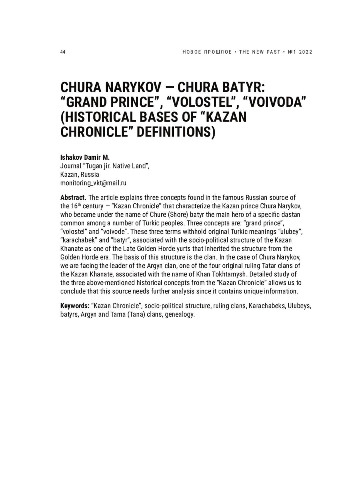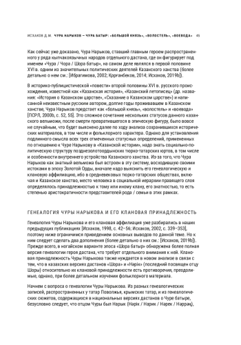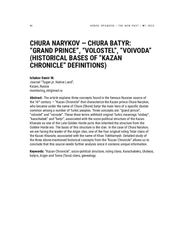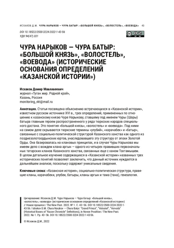 ИСХАКОВ Д. М. ЧУРА НАРЫКОВ - ЧУРА БАТЫР:"БОЛЬШОЙ КНЯЗЬ", "ВОЛОСТЕЛЬ", "ВОЕВОДА" (ИСТОРИЧЕСКИЕ ОСНОВАНИЯ ОПРЕДЕЛЕНИЙ"КАЗАНСКОЙ ИСТОРИИ") // НОВОЕ ПРОШЛОЕ. 2022. № 1