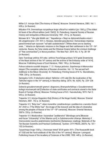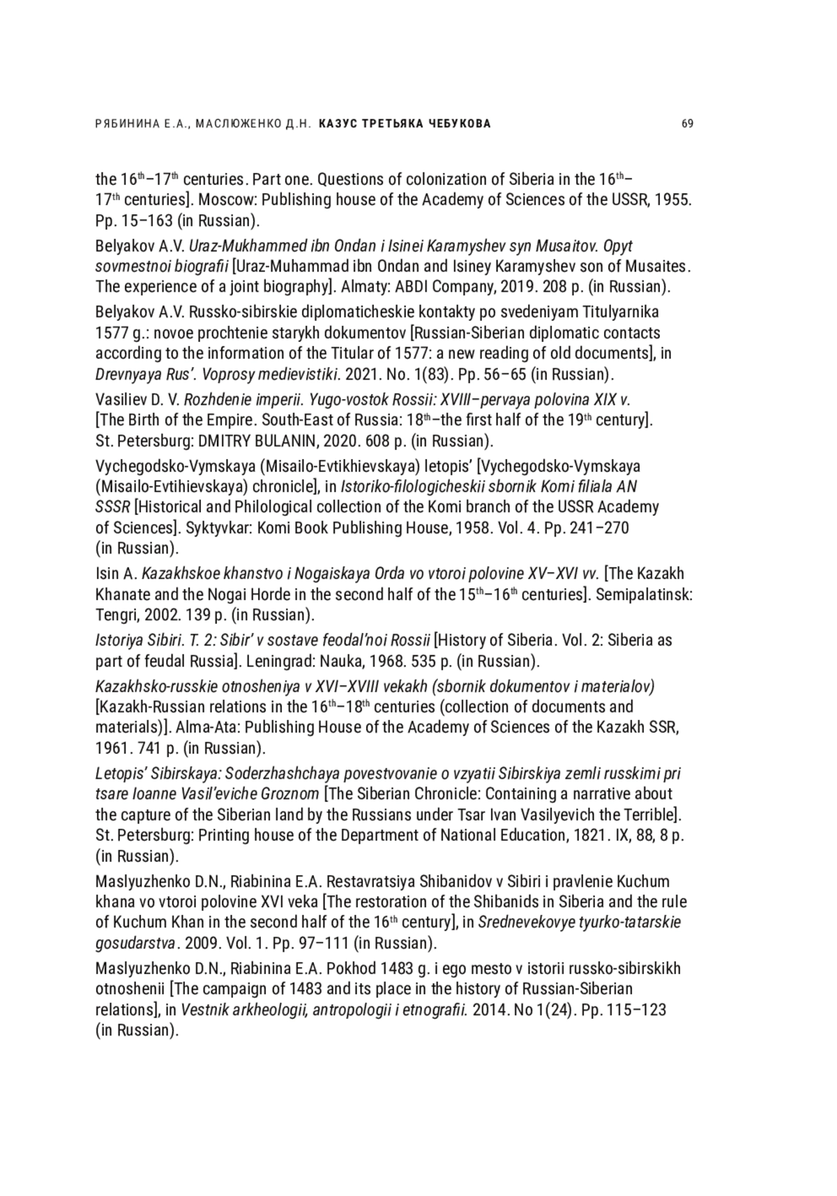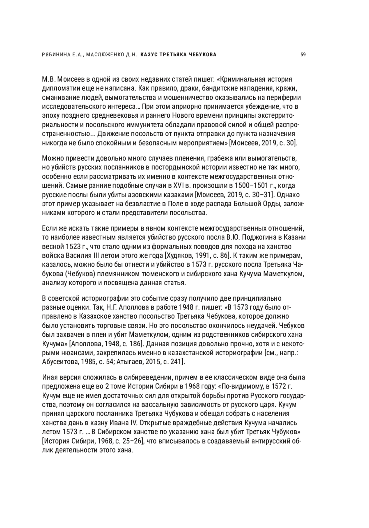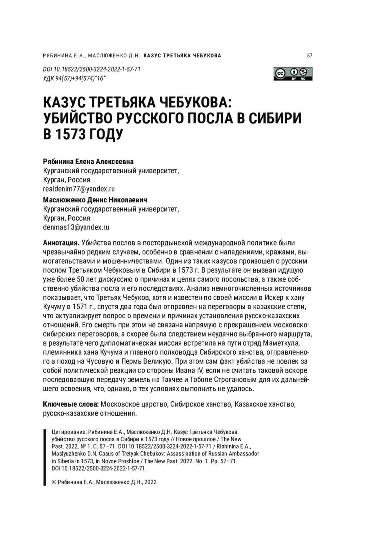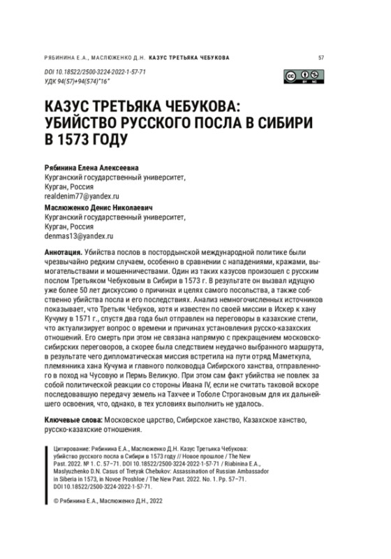 РЯБИНИНА Е. А., МАСЛЮЖЕНКО Д. Н. КАЗУС ТРЕТЬЯКА ЧЕБУКОВА: УБИЙСТВО РУССКОГО ПОСЛА В СИБИРИ В 1573 ГОДУ // НОВОЕ ПРОШЛОЕ. 2022. № 1