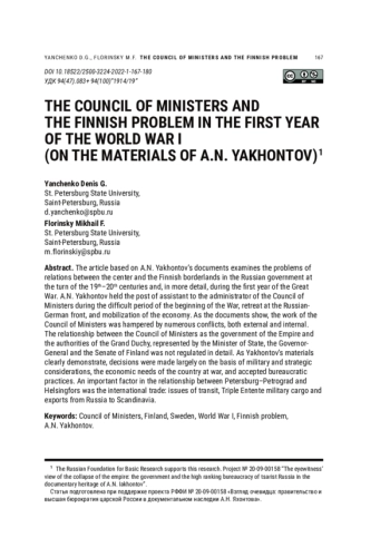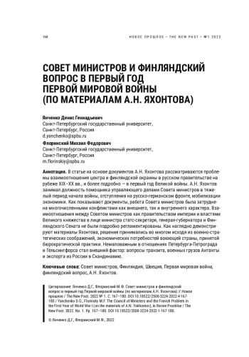 The article based on A. N. Yakhontov’s documents examines the problems of relations between the center and the Finnish borderlands in the Russian government at the turn of the 19th–20th centuries and, in more detail, during the first year of the Great War. A. N. Yakhontov held the post of assistant to the administrator of the Council of Ministers during the difficult period of the beginning of the War, retreat at the RussianGerman front, and mobilization of the economy. As the documents show, the work of the Council of Ministers was hampered by numerous conflicts, both external and internal. The relationship between the Council of Ministers as the government of the Empire and the authorities of the Grand Duchy, represented by the Minister of State, the GovernorGeneral and the Senate of Finland was not regulated in detail. As Yakhontov’s materials clearly demonstrate, decisions were made largely on the basis of military and strategic considerations, the economic needs of the country at war, and accepted bureaucratic practices. An important factor in the relationship between Petersburg–Petrograd and Helsingfors was the international trade: issues of transit, Triple Entente military cargo and exports from Russia to Scandinavia