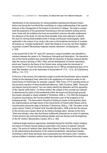 Identification of the mechanisms for solving problems besetting the Russian Empire before and during the First World War contributes to a deep understanding of the specific features of the management of the Empire on the brink of collapse. The need to comprehend the experience of the government functioning in the new extreme working environment, faced with the problems that have accumulated in previous decades, emphasizes the relevance of the study. For the last three decades, there were attempts to identify the tools for solving these problems both in foreign and Russian historiography. Quite applicable in the context of our study is the view on the borderline territories of continental empires as “complex borderlands”, where the influence of not two, but three neighboring powers clashed” [Rossiiskaya imperiya mezhdu reformami i revolyutsiyami…, 2021, p. 264].