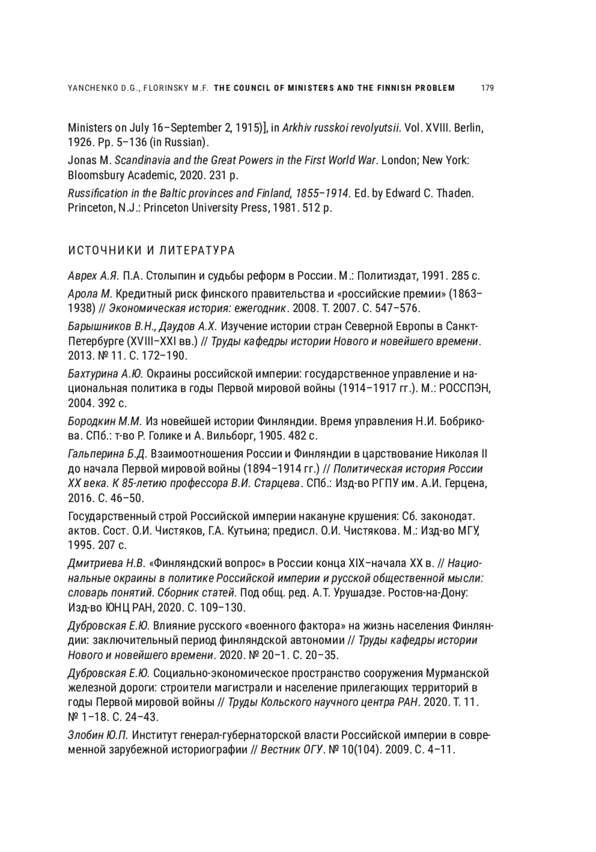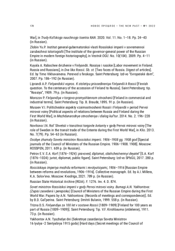 9. Дубровская Е.Ю. Влияние русского “военного фактора” на жизнь населения Финляндии: заключительный период финляндской автономии // Труды кафедры истории Нового и новейшего времени. 2020. № 20-1. С. 20-35. EDN: FBFGFZ